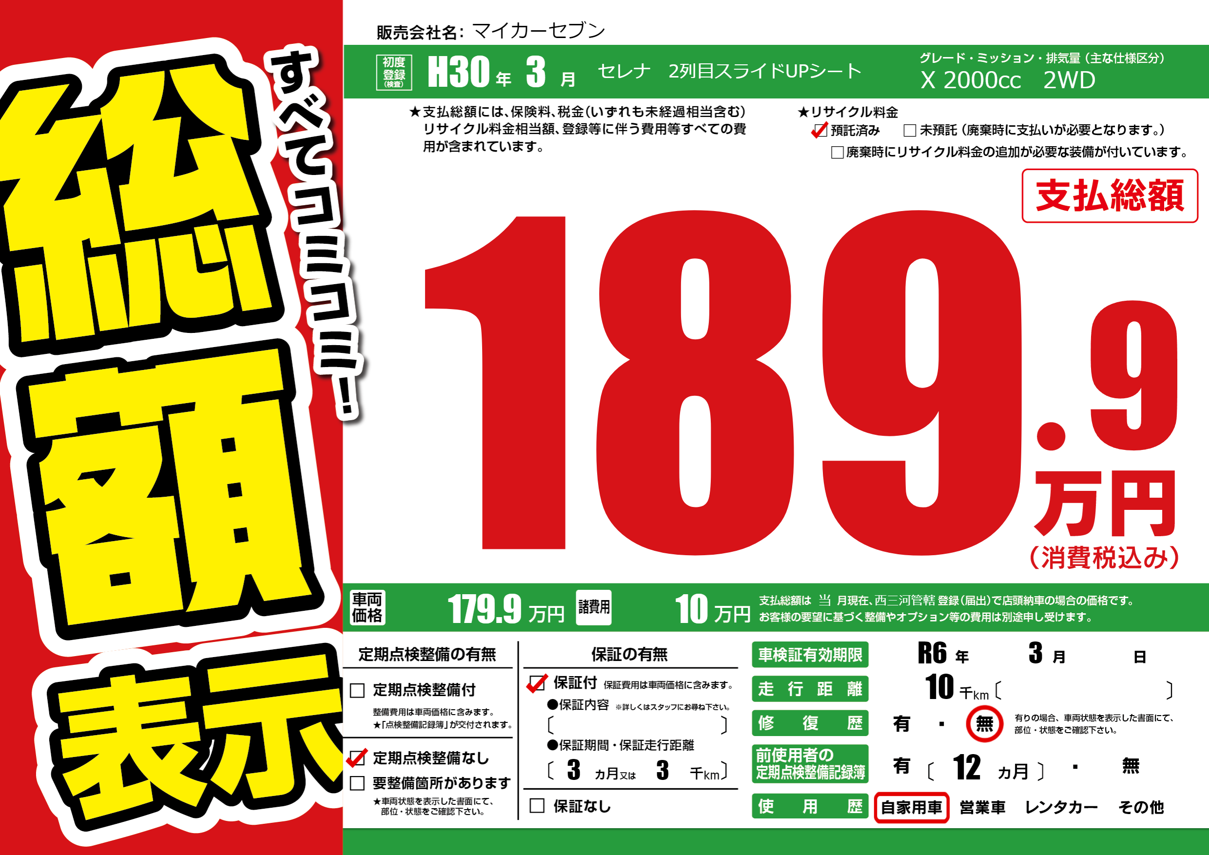 | 走行キロ | 1万km | 初年度登録 | H30年3月 |