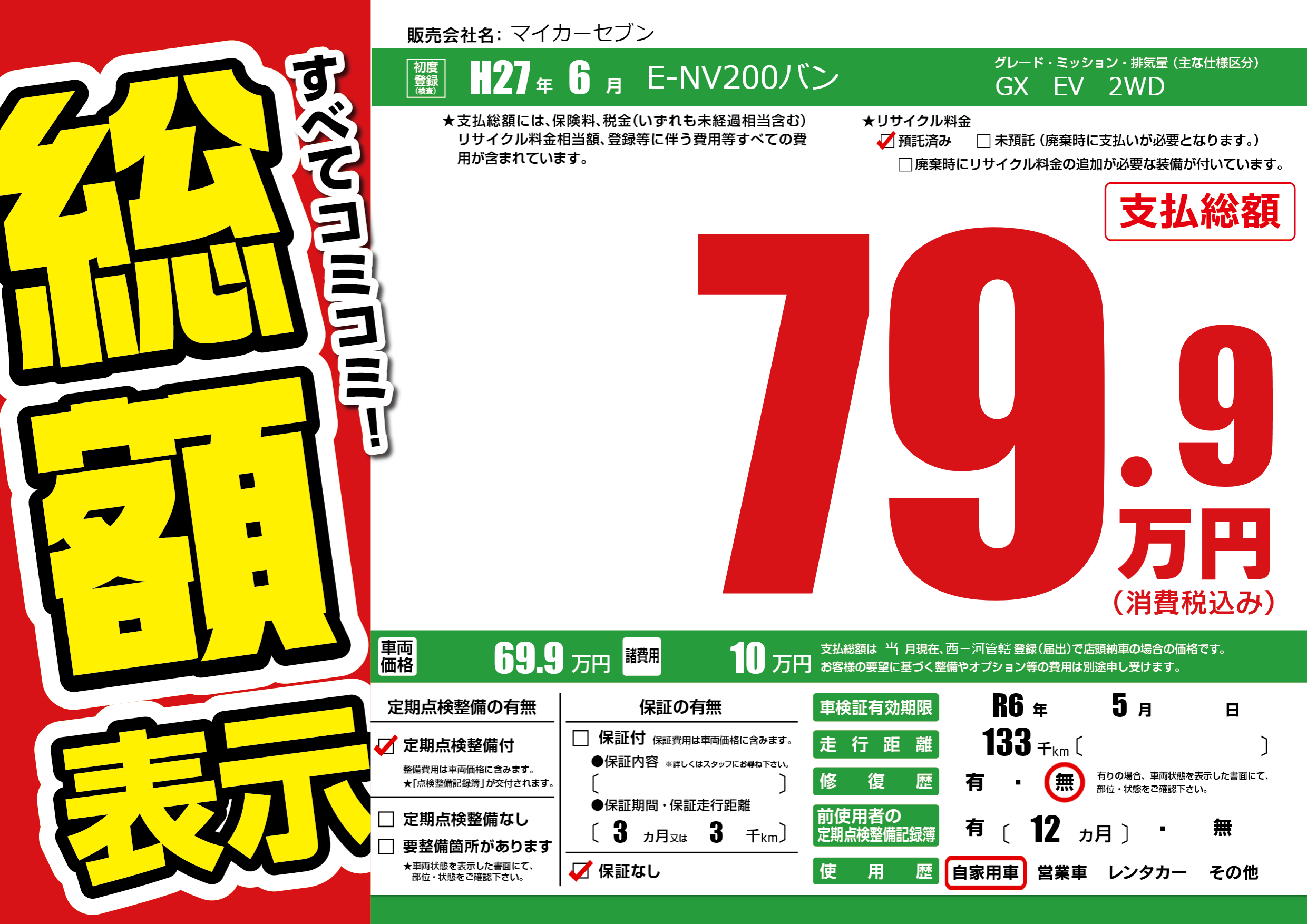 | 車名 | E-NV200バン | グレード ミッション 排気量 |