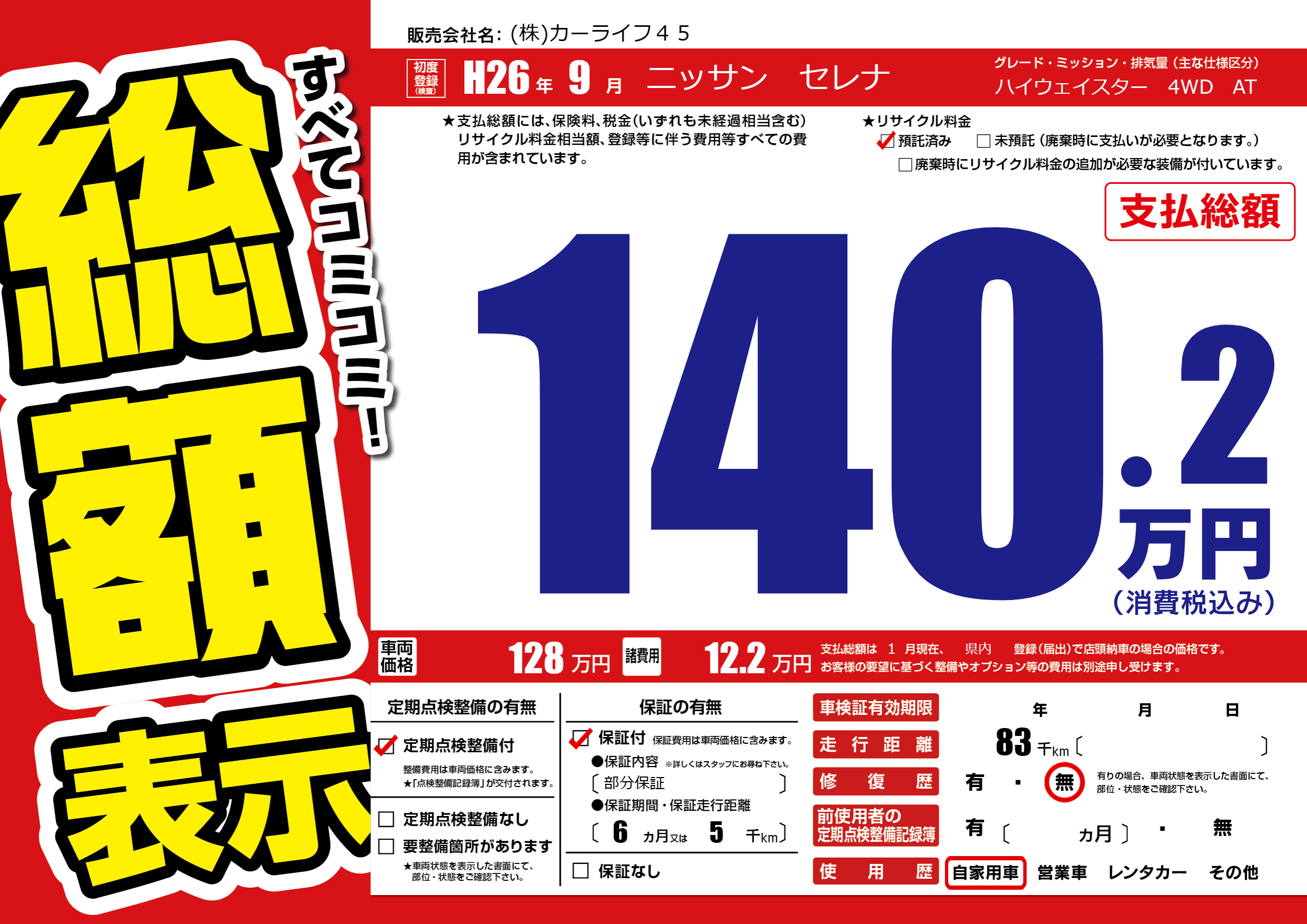 | 走行キロ | 8.3万km | 初年度登録 | H26年9月 |