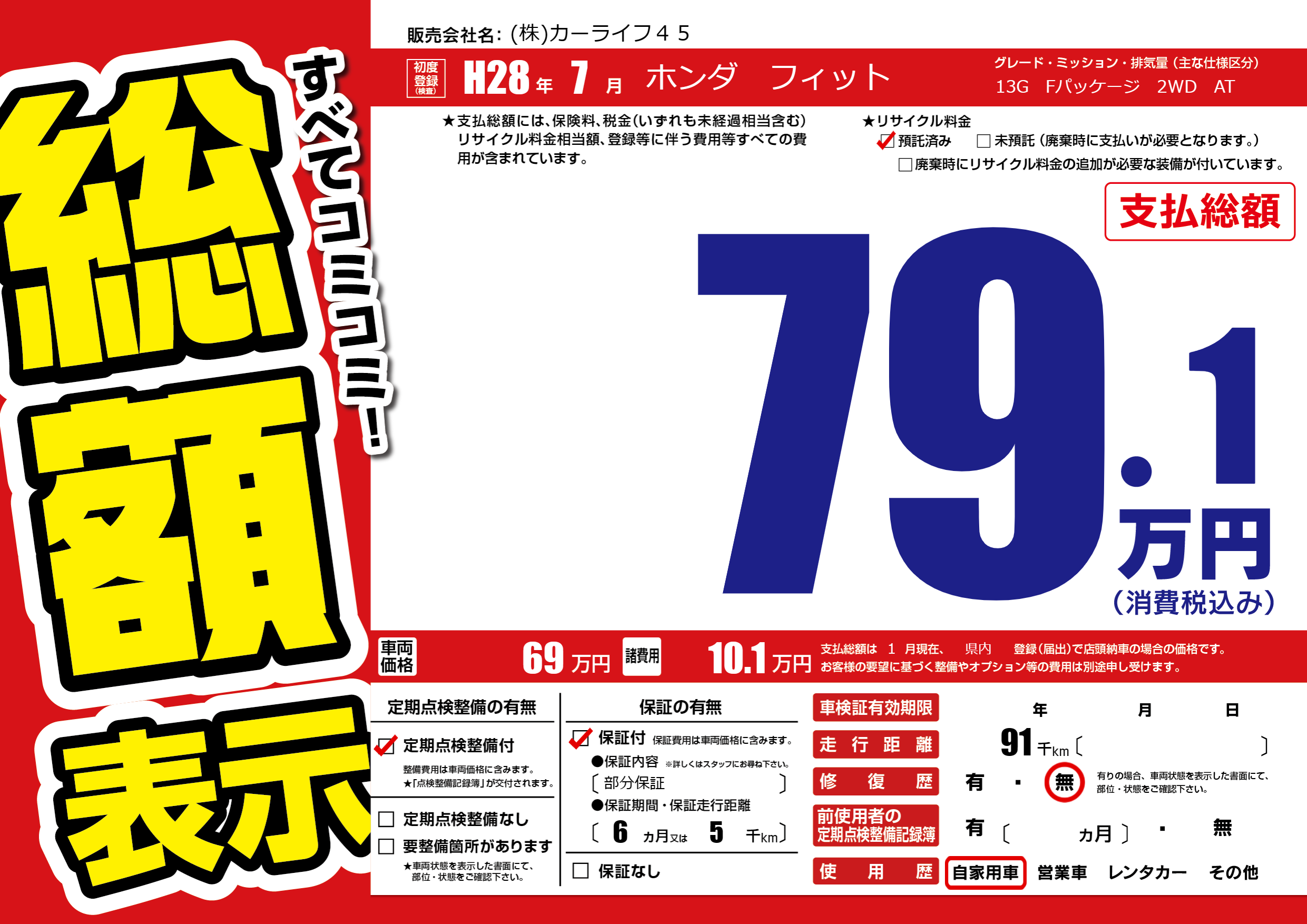| 車名 | ホンダ フィット | グレード ミッション 排気量 |