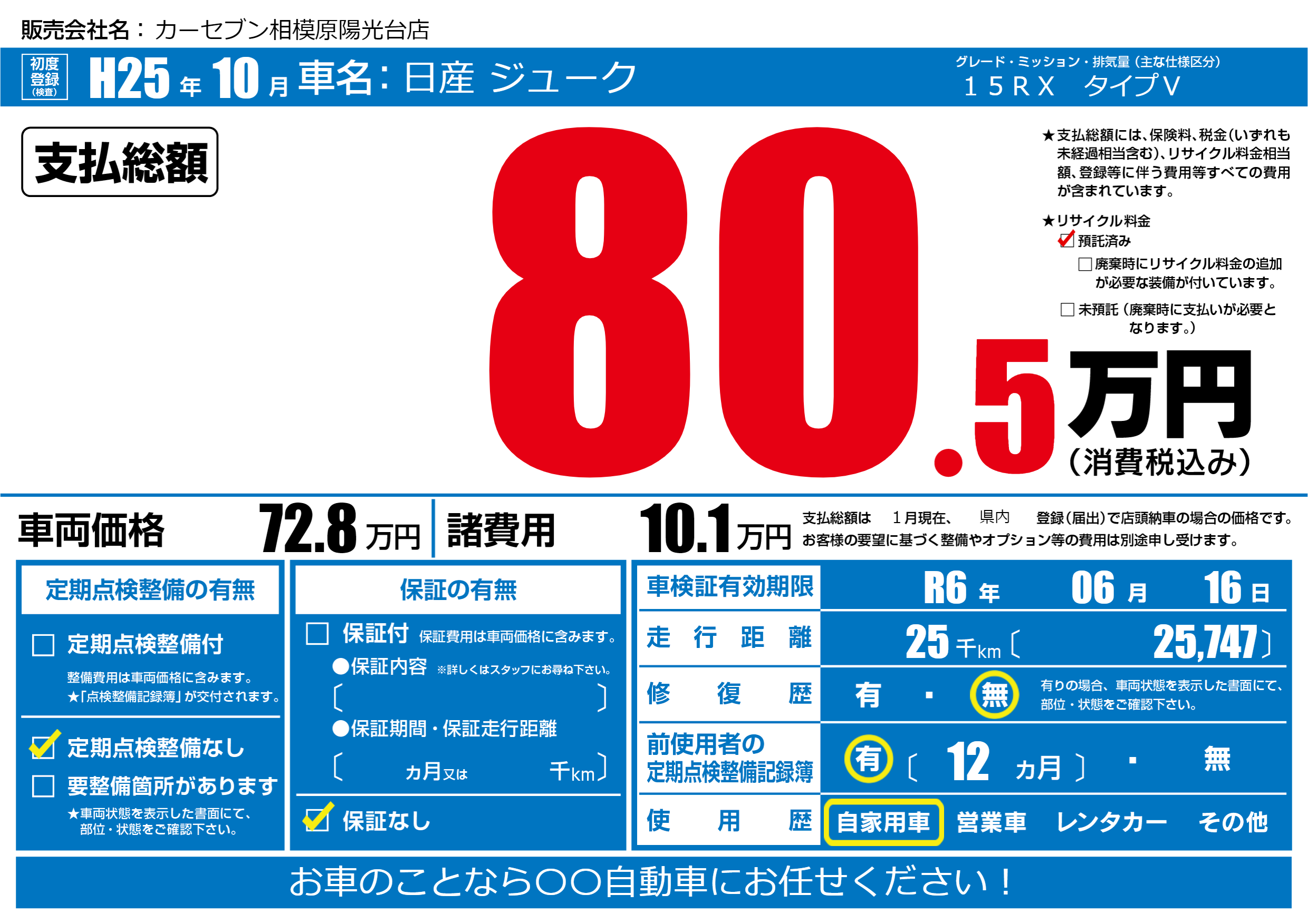 | 車名 | 日産 ジューク | グレード ミッション 排気量 |