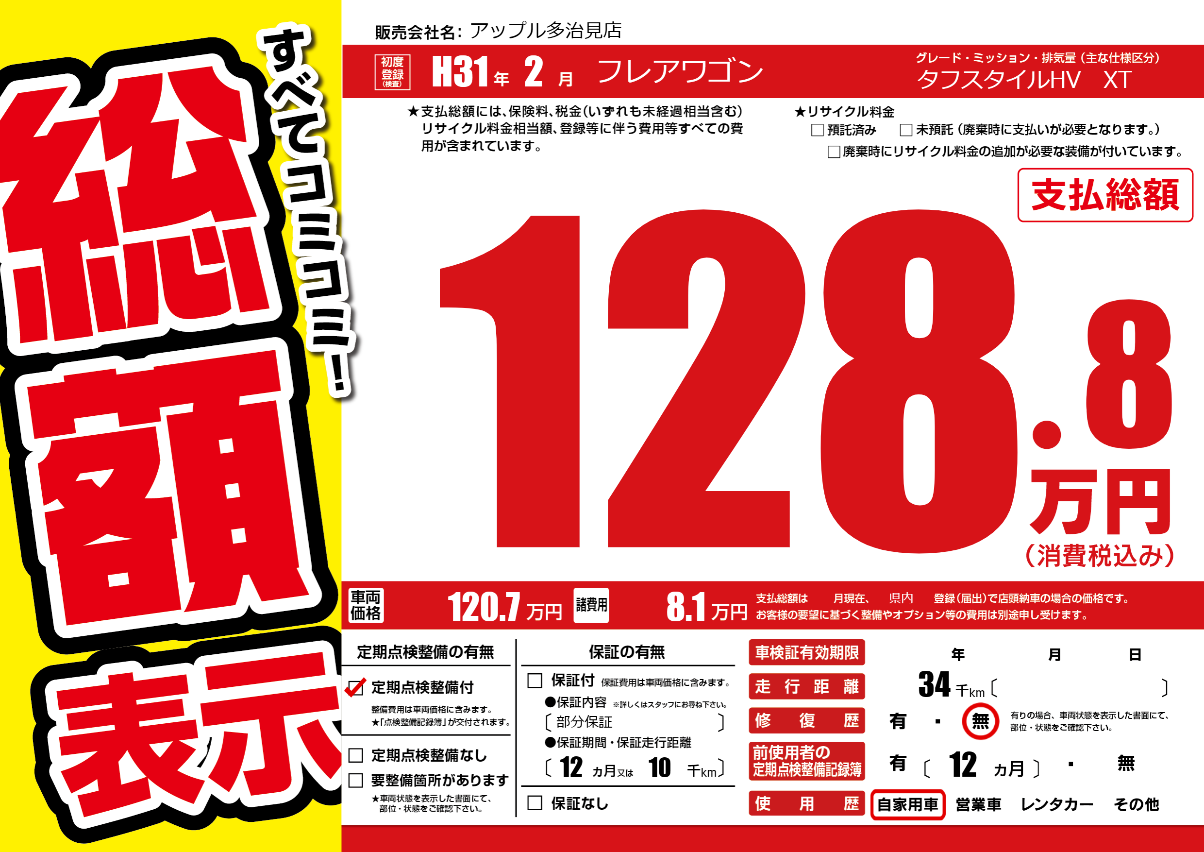 | 車名 | フレアワゴン | グレード ミッション 排気量 |