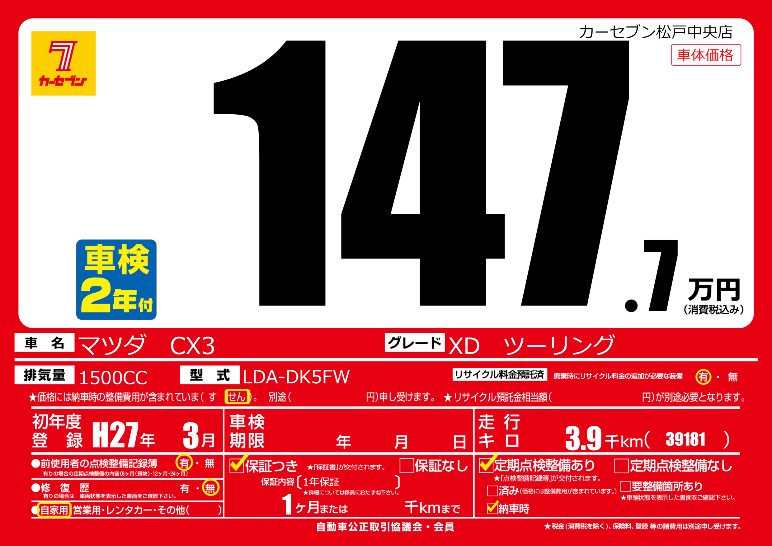 | 車名 | マツダ CX3 | グレード ミッション 排気量 |