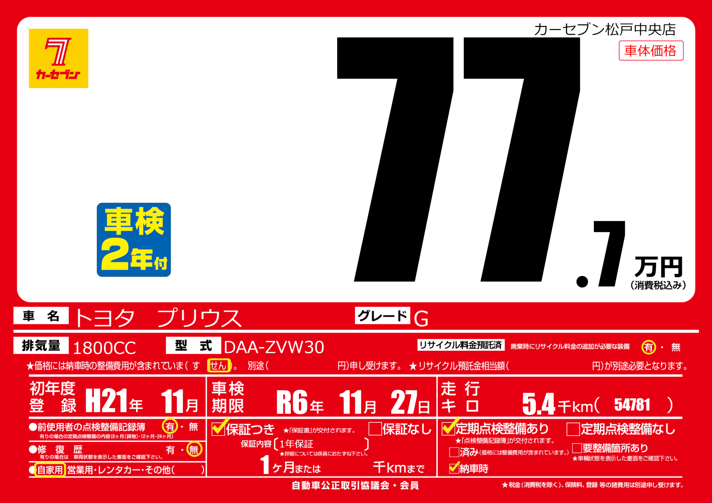 | 車名 | トヨタ プリウス | グレード ミッション 排気量 |