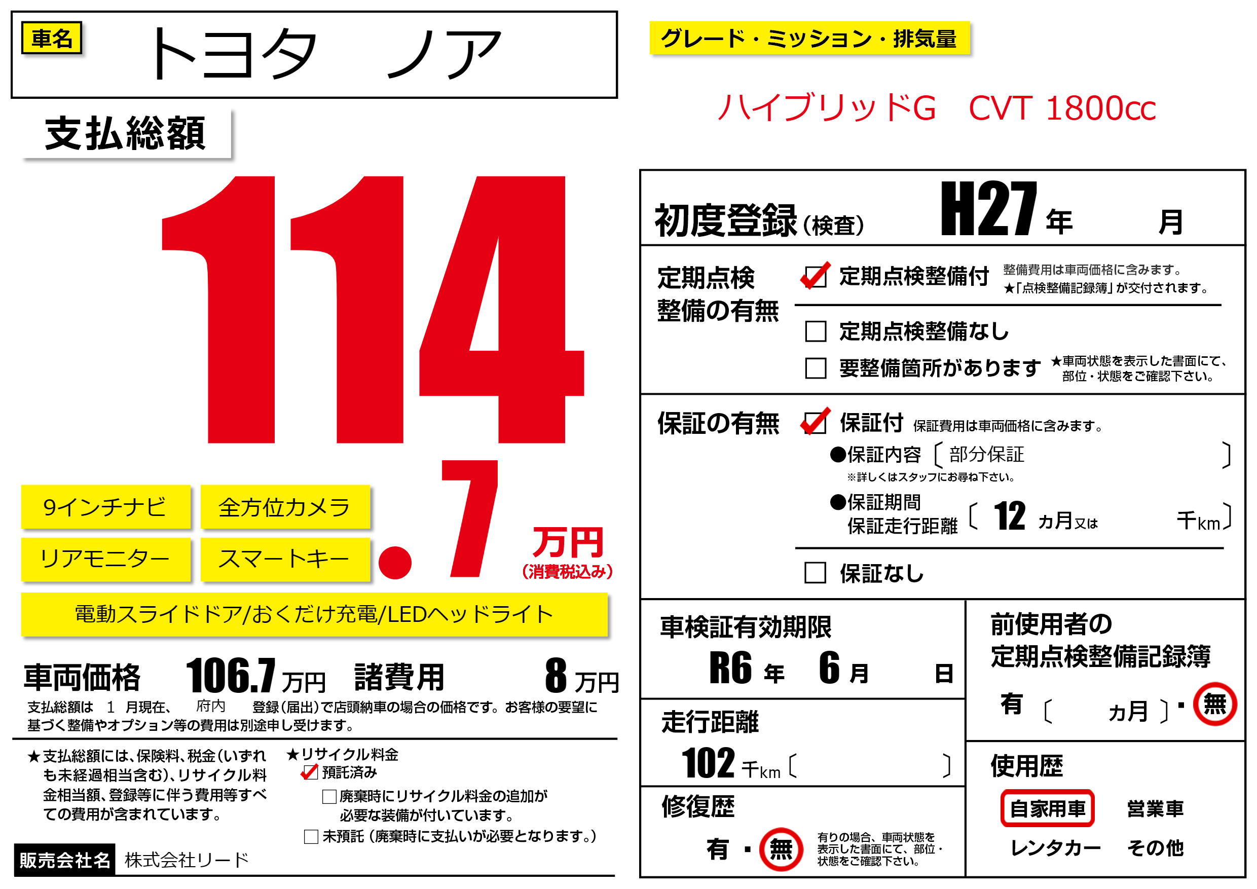 | 車名 | トヨタ ノア | グレード ミッション 排気量 |