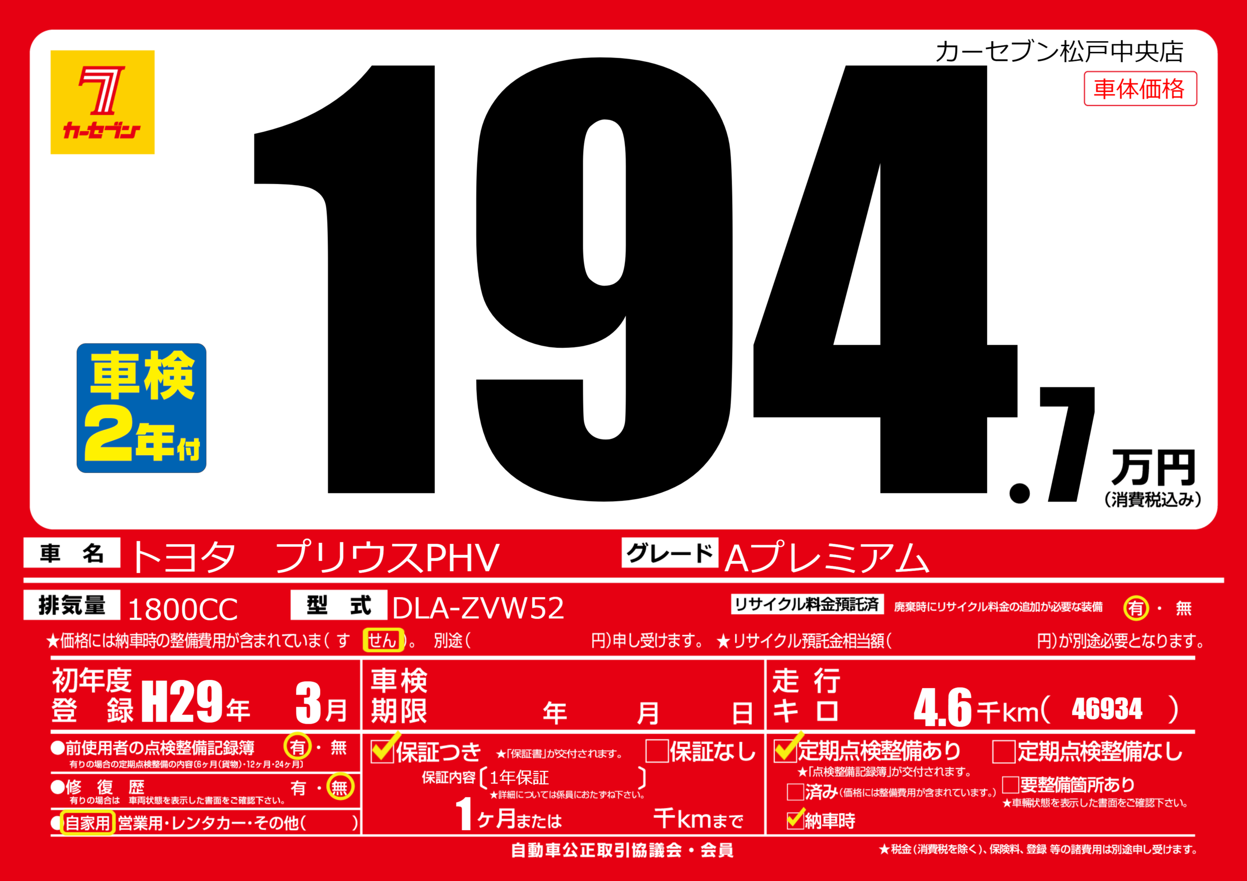 | 車名 | トヨタ プリウスPHV | グレード ミッション 排気量 |