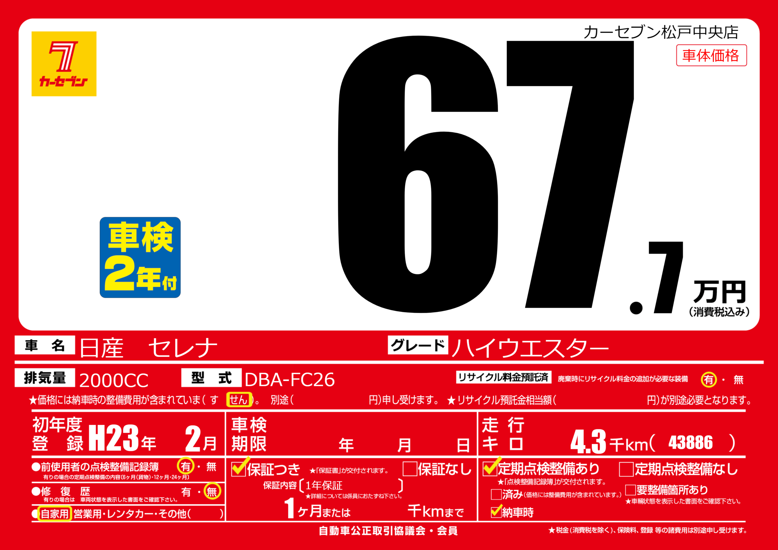 | 車名 | 日産 セレナ | グレード ミッション 排気量 |