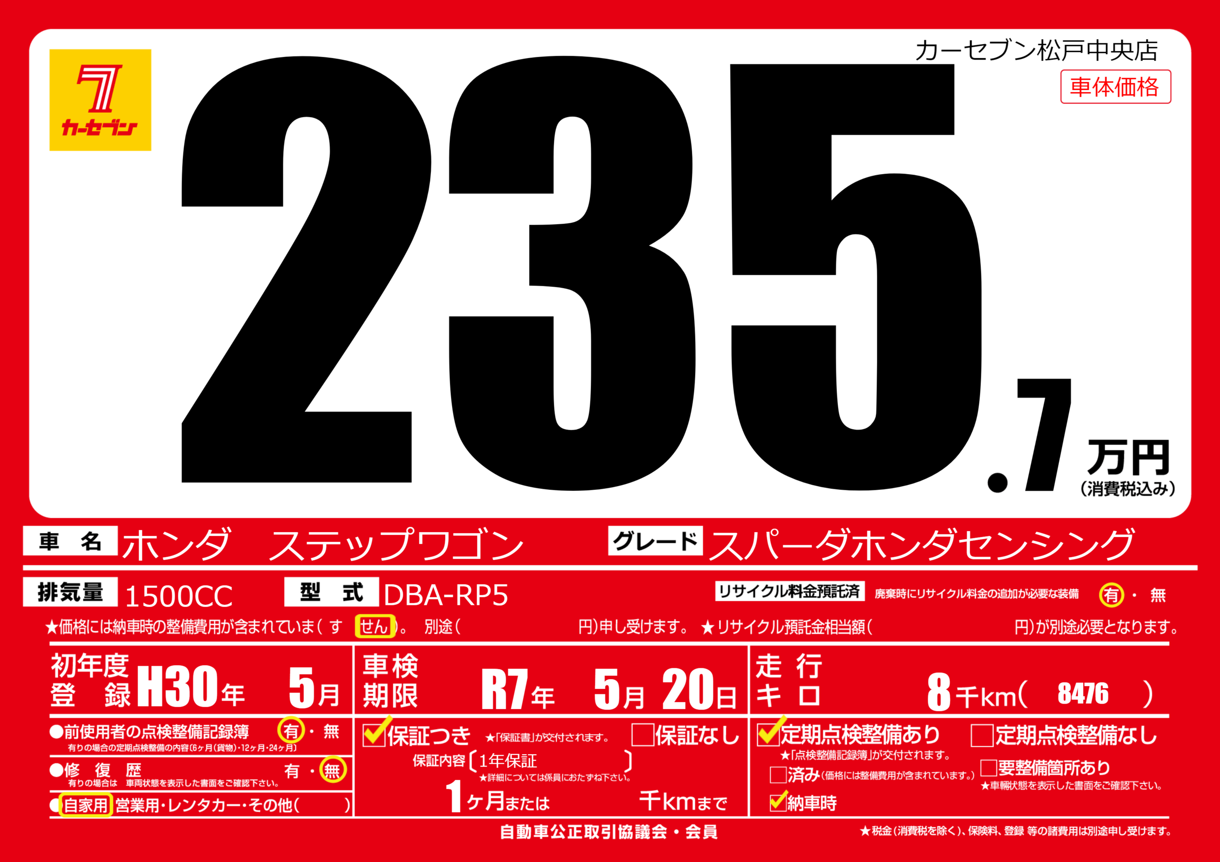 | 走行キロ | 0.8万km | 初年度登録 | H30年5月 |