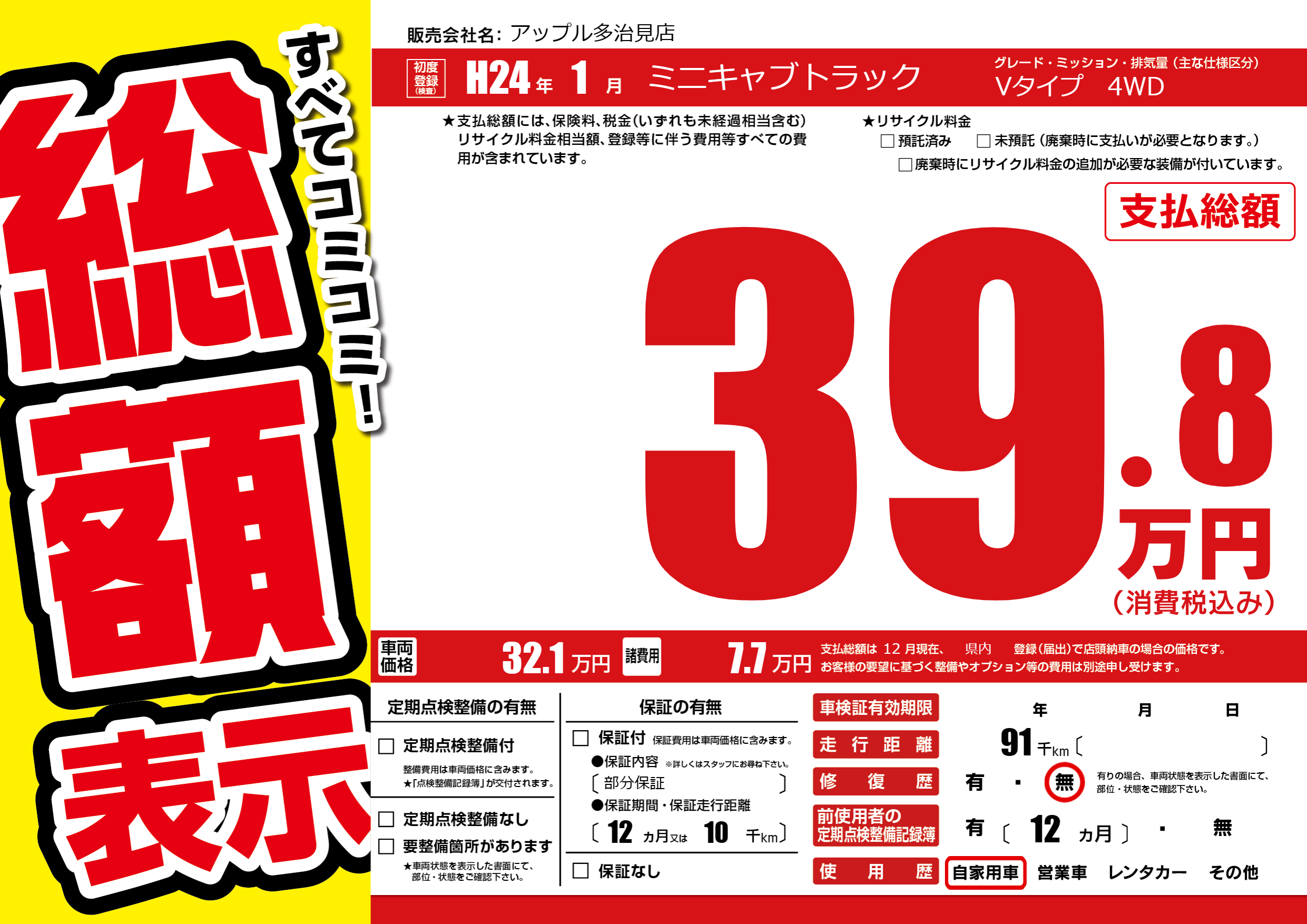 | 走行キロ | 9.1万km | 初年度登録 | H24年1月 |