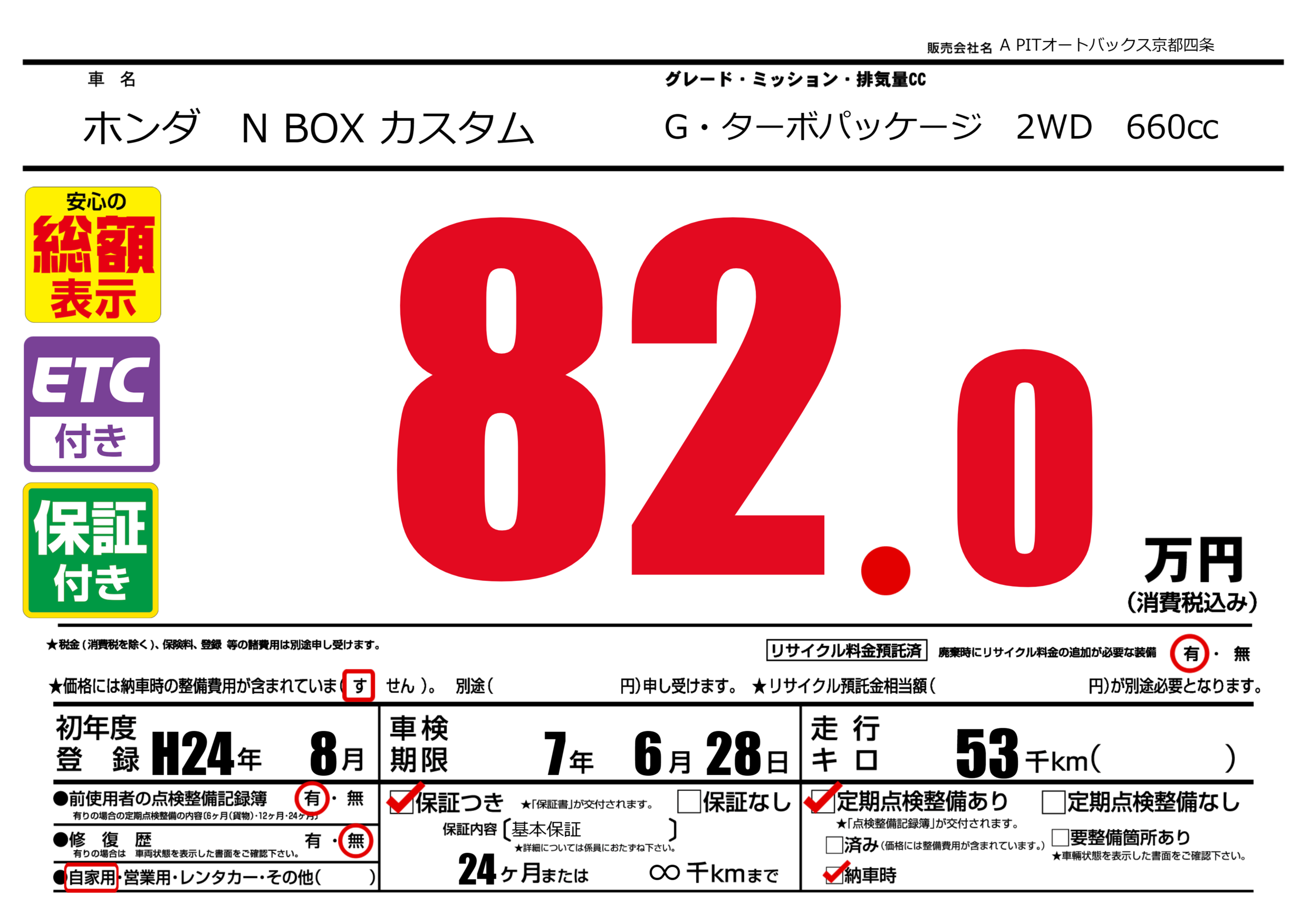 | 車名 | ホンダ N BOX カスタム | グレード ミッション 排気量 |
