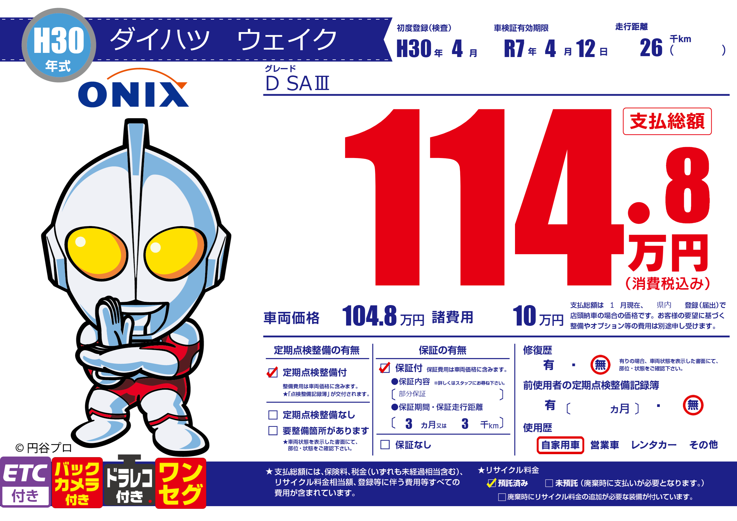 | 走行キロ | 2.6万km | 初年度登録 | H30年4月 |