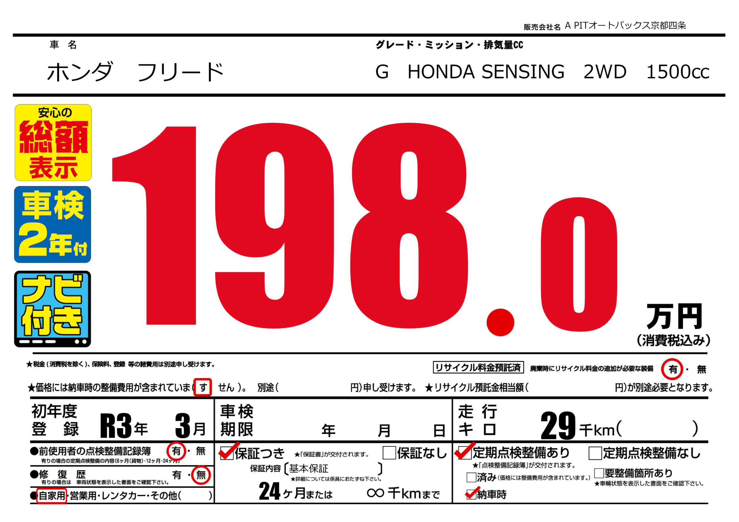 | 車名 | ホンダ フリード | グレード ミッション 排気量 |