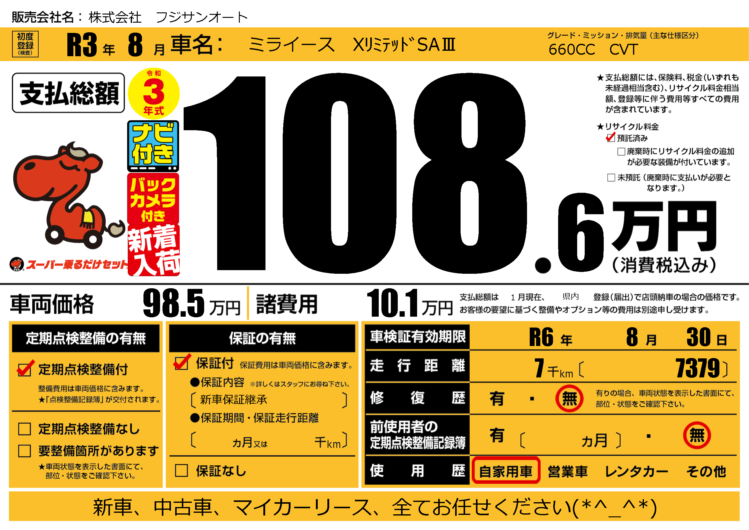 | 走行キロ | 0.7万km | 初年度登録 | R3年8月 |