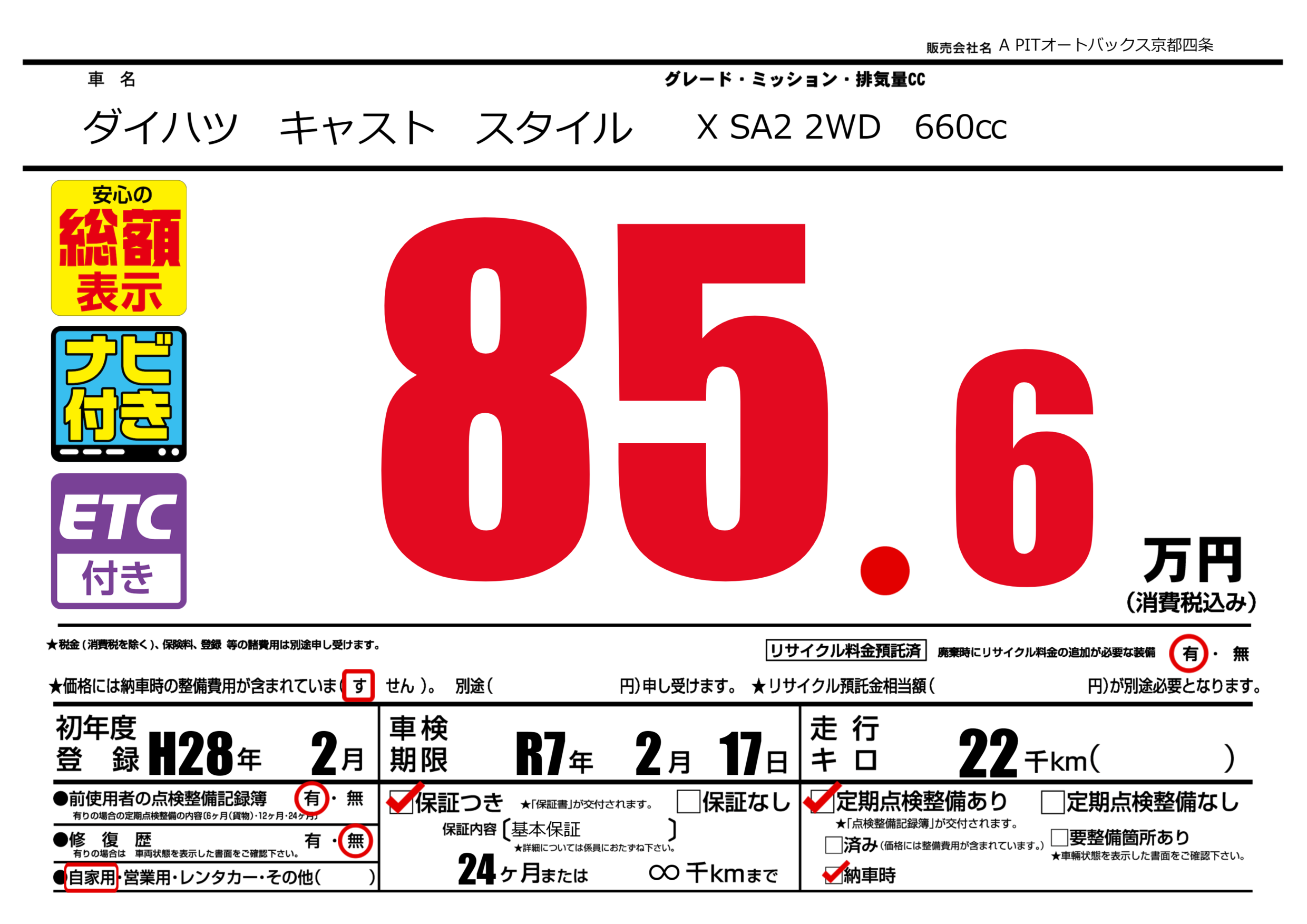 | 定期点検整備 | 定期点検整備あり 納車時あり | ||