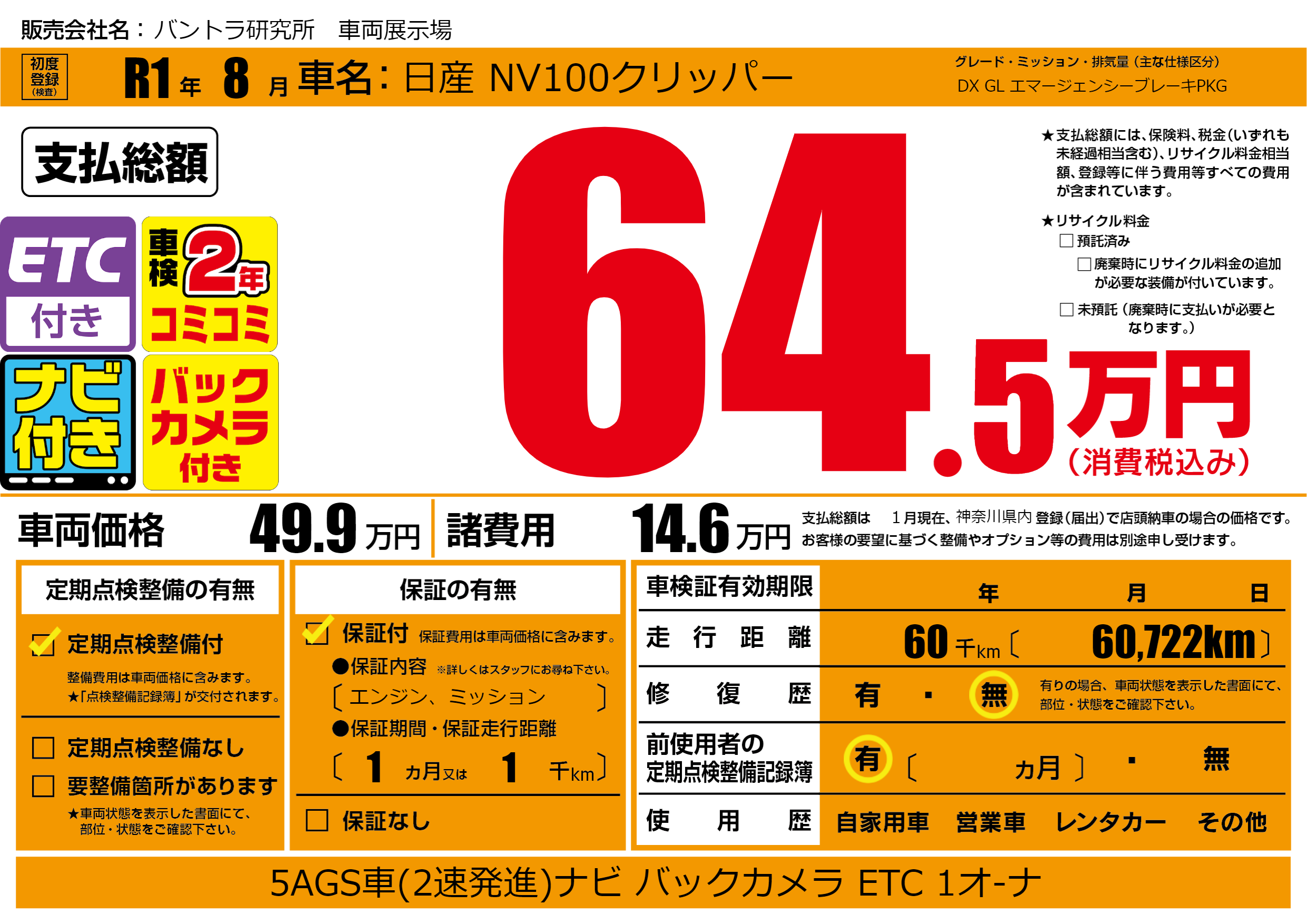 | 車名 | 日産 NV100クリッパー | グレード ミッション 排気量 |