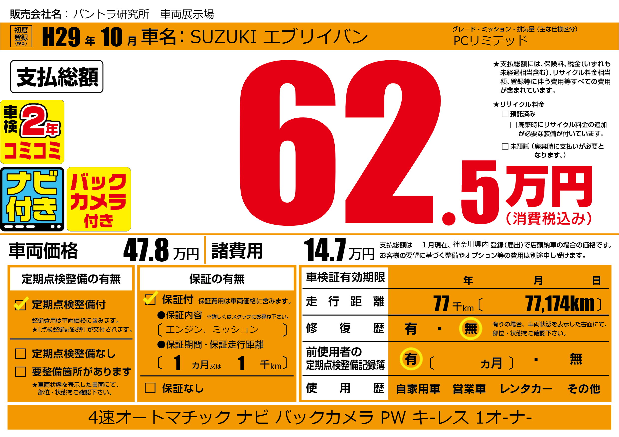 | 車名 | SUZUKI エブリイバン | グレード ミッション 排気量 |