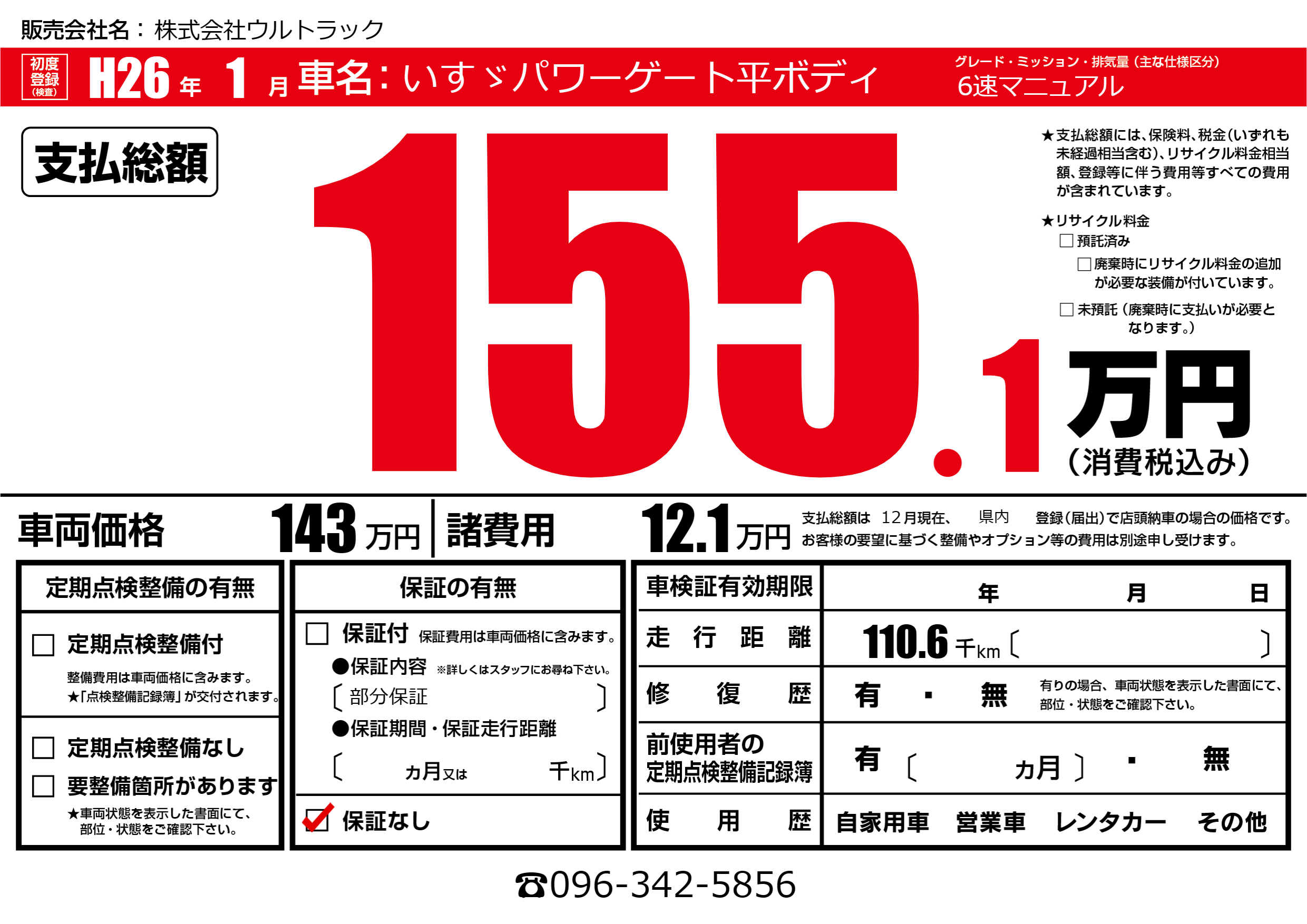 | 車名 | いすゞパワーゲート平ボディ | グレード ミッション 排気量 |