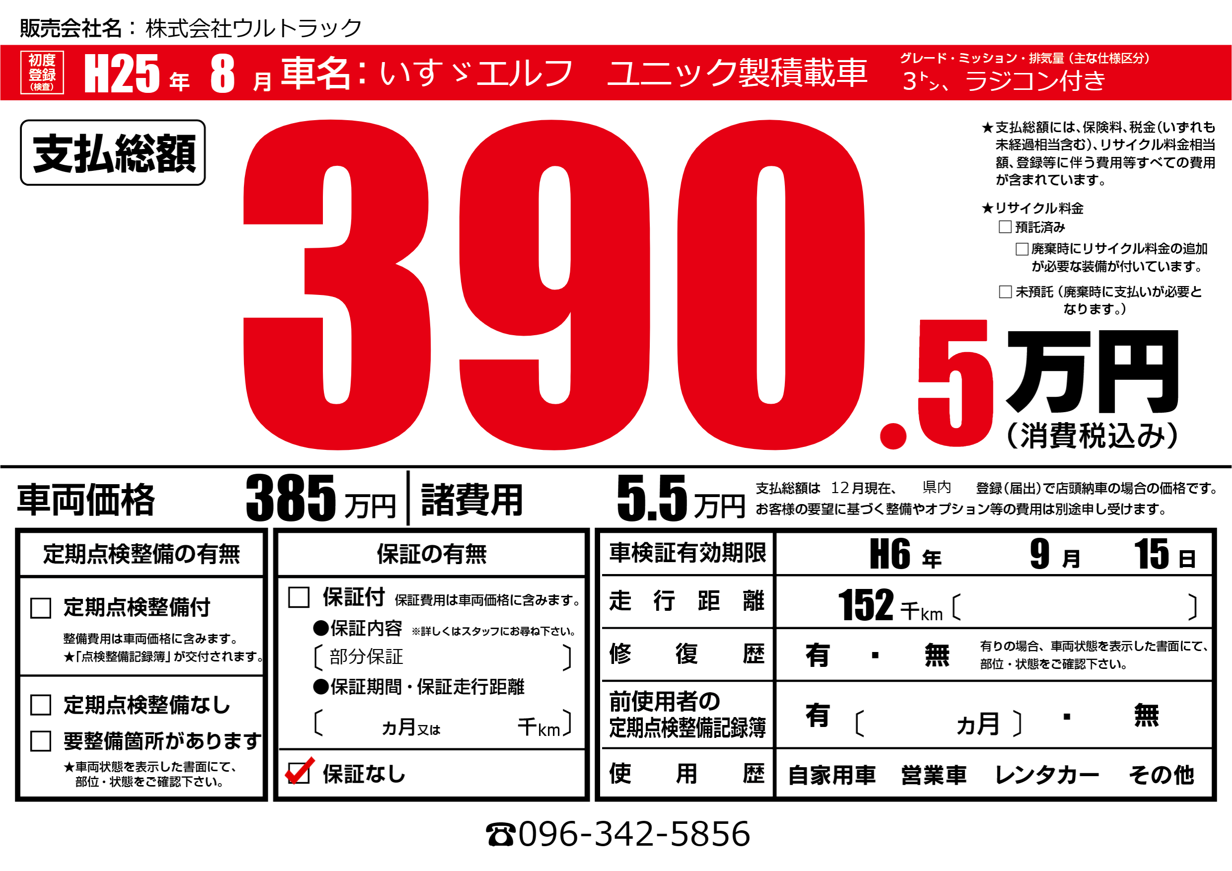 | 車名 | いすゞエルフ ユニック製積載車 | グレード ミッション 排気量 |