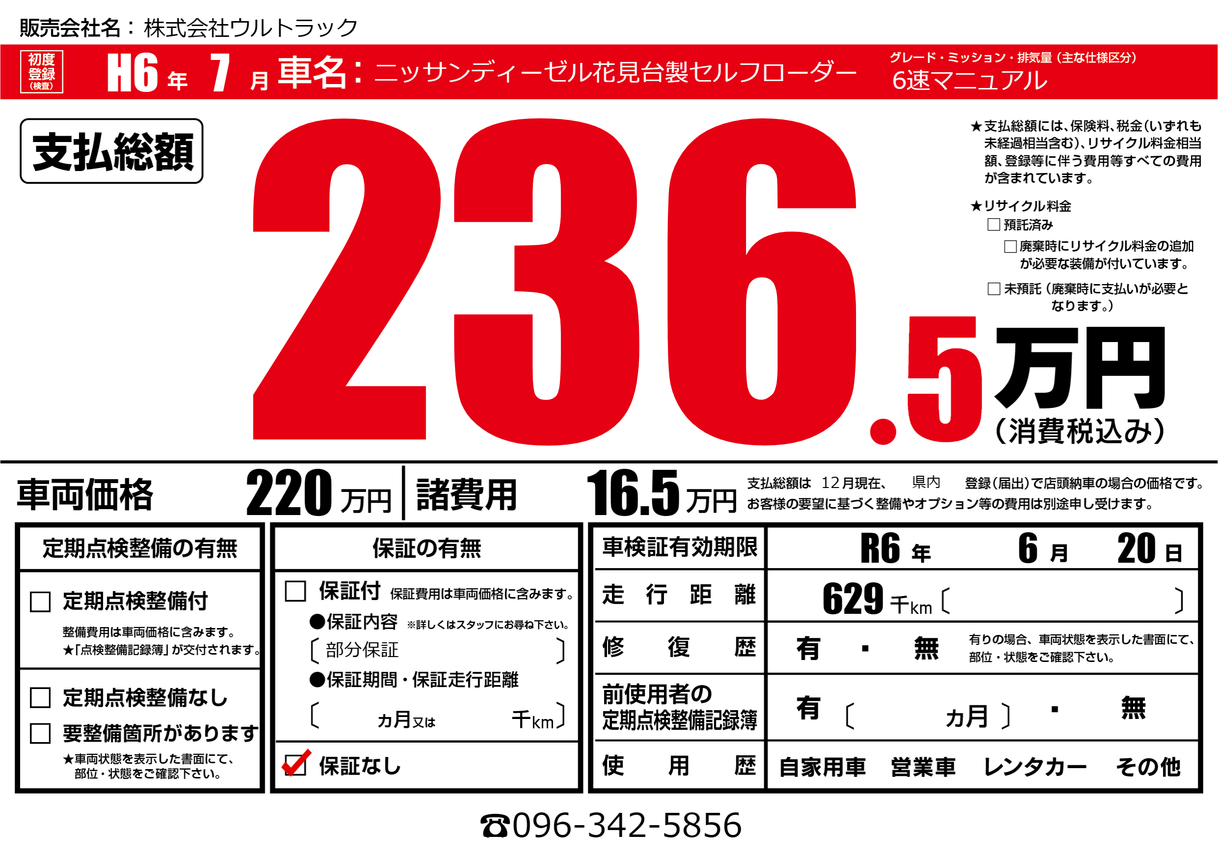 | 走行キロ | 62.9万km | 初年度登録 | H6年7月 |