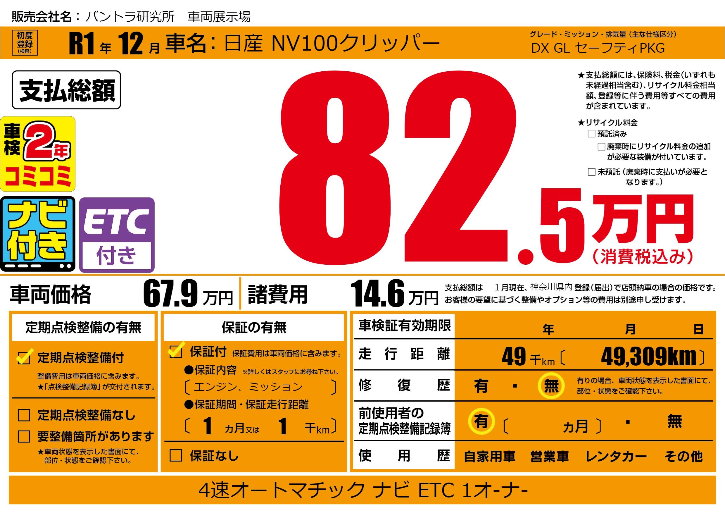 | 車名 | 日産 NV100クリッパー | グレード ミッション 排気量 |