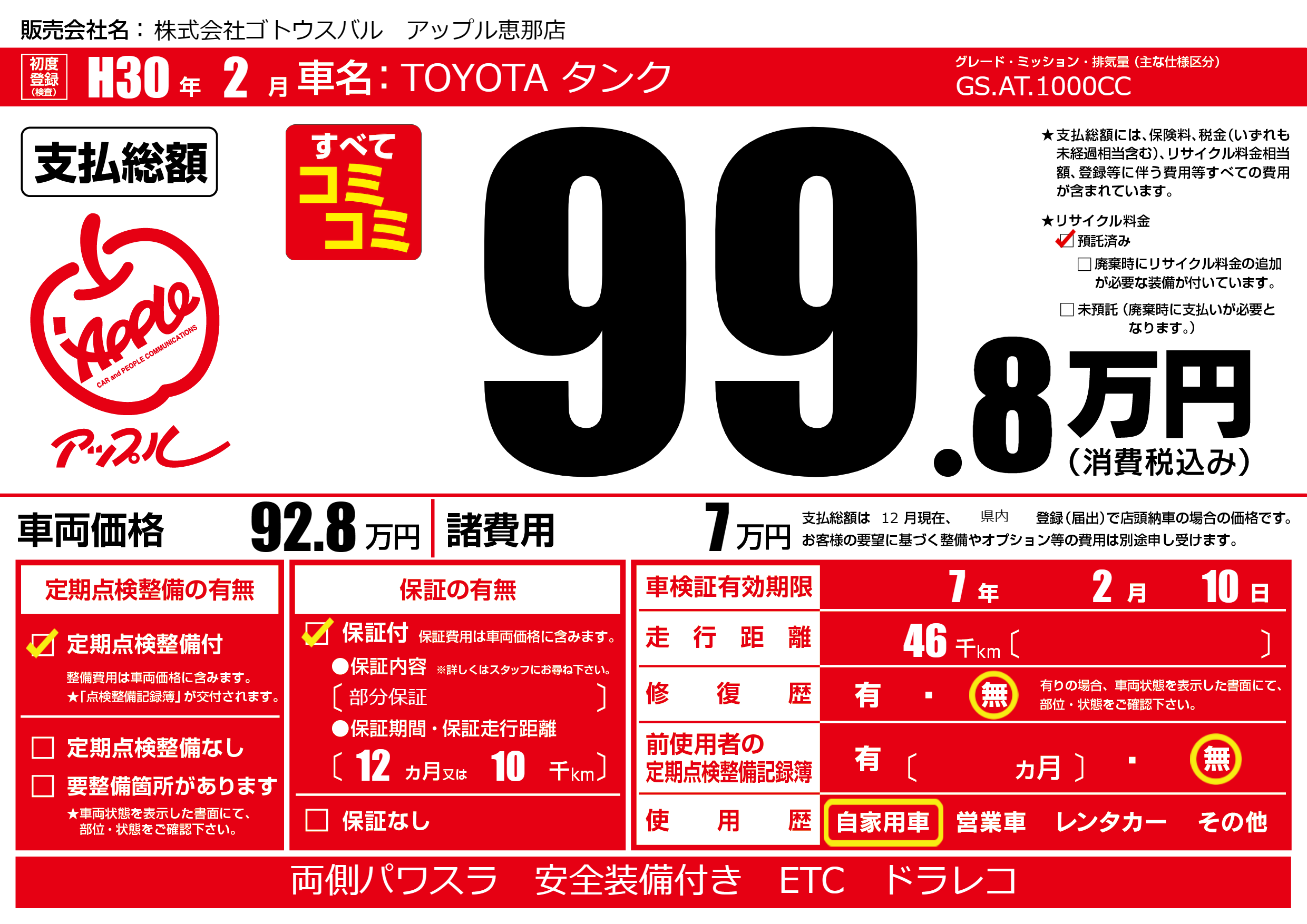 | 車名 | TOYOTA タンク | グレード ミッション 排気量 |