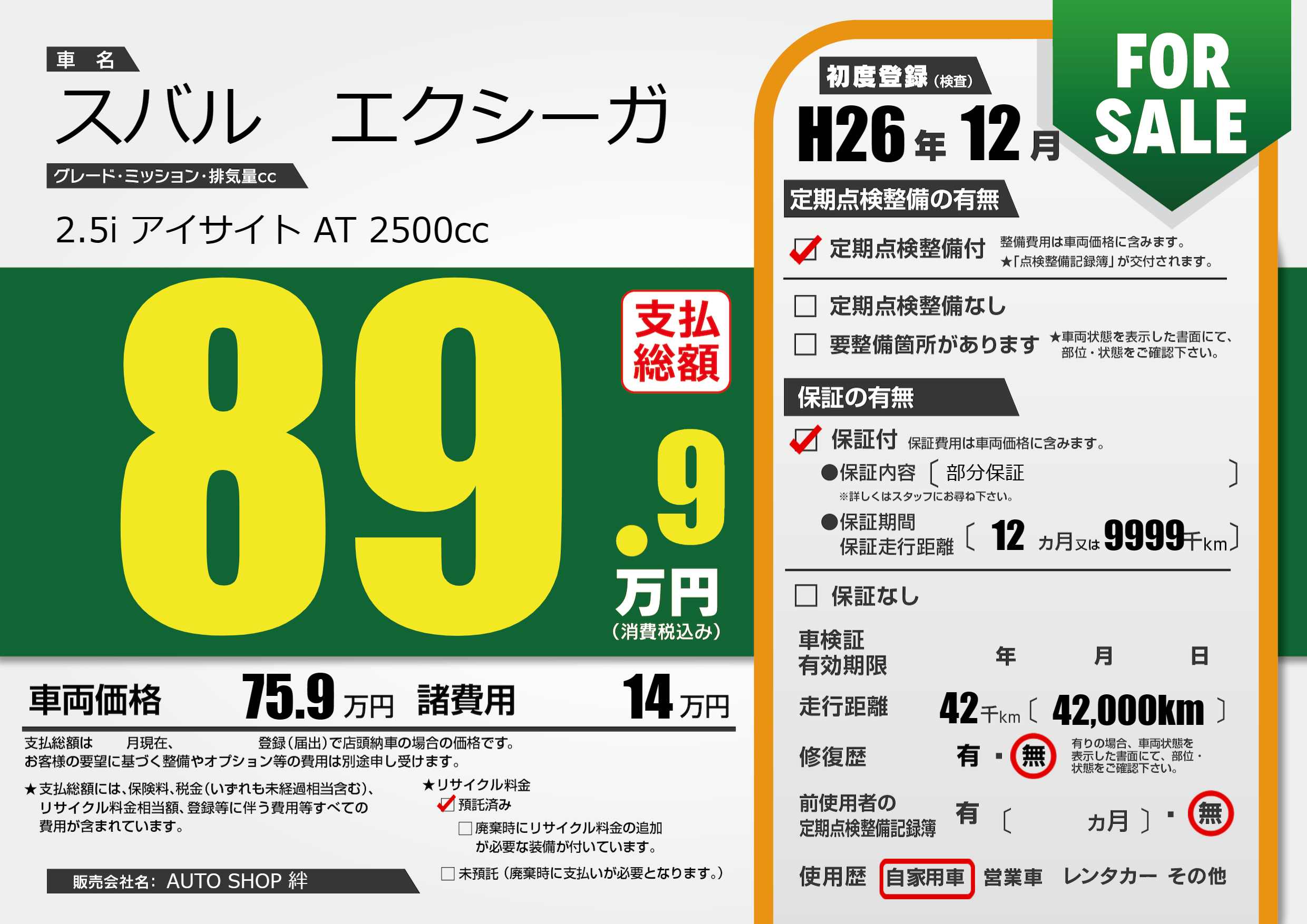 | 車名 | スバル エクシーガ | グレード ミッション 排気量 |