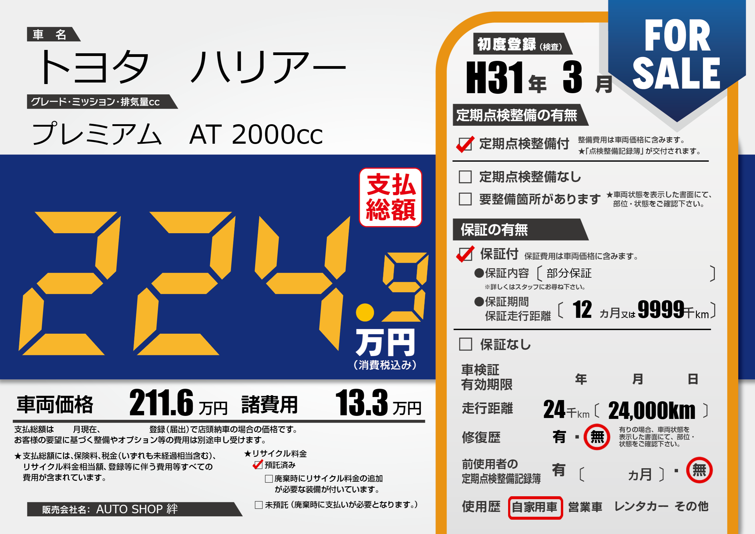 | 車名 | トヨタ ハリアー | グレード ミッション 排気量 |