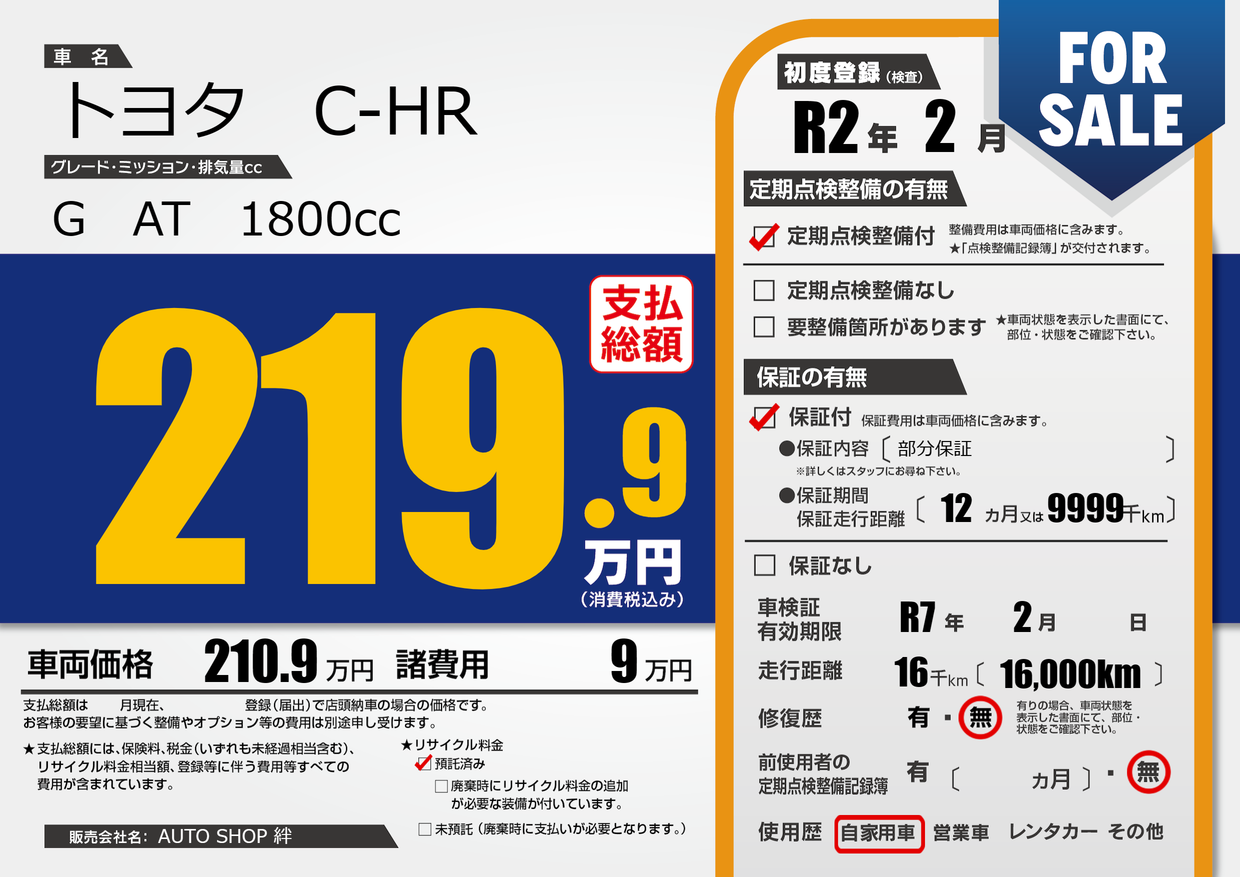 | 車名 | トヨタ C-HR | グレード ミッション 排気量 |