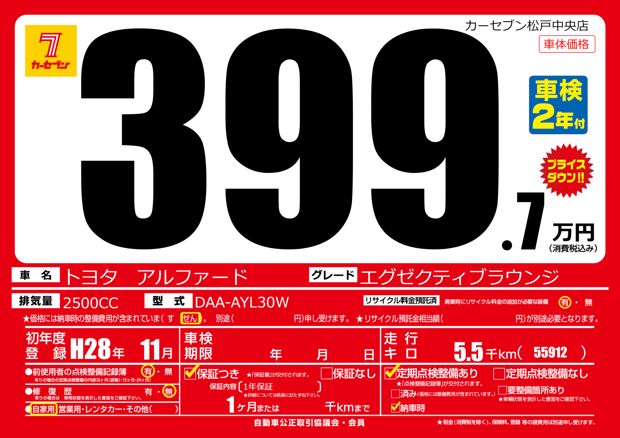 | 車名 | トヨタ アルファード | グレード ミッション 排気量 |
