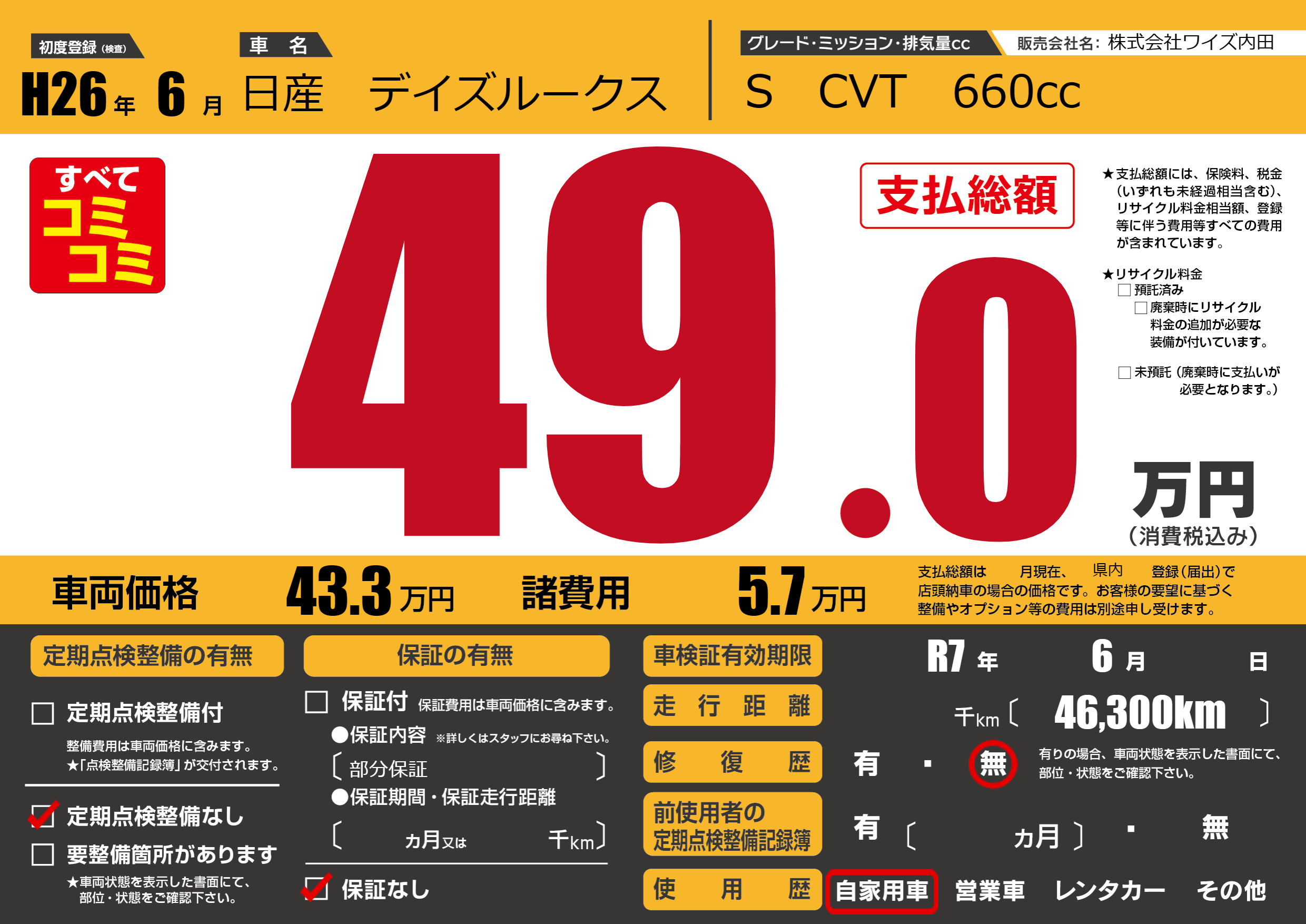 | 車名 | 日産 デイズルークス | グレード ミッション 排気量 |