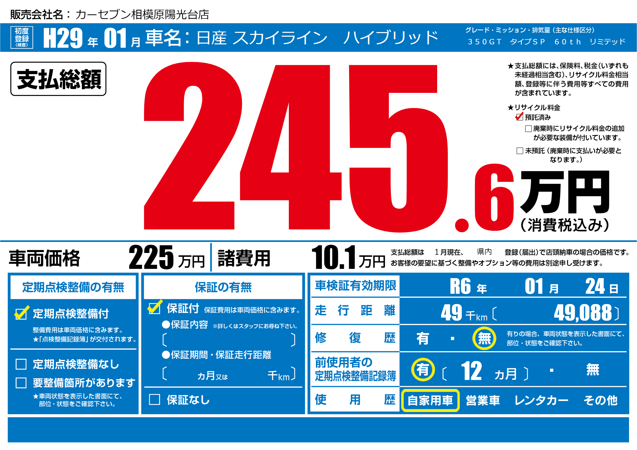 | 車名 | 日産 スカイライン ハイブリッド | グレード ミッション 排気量 |