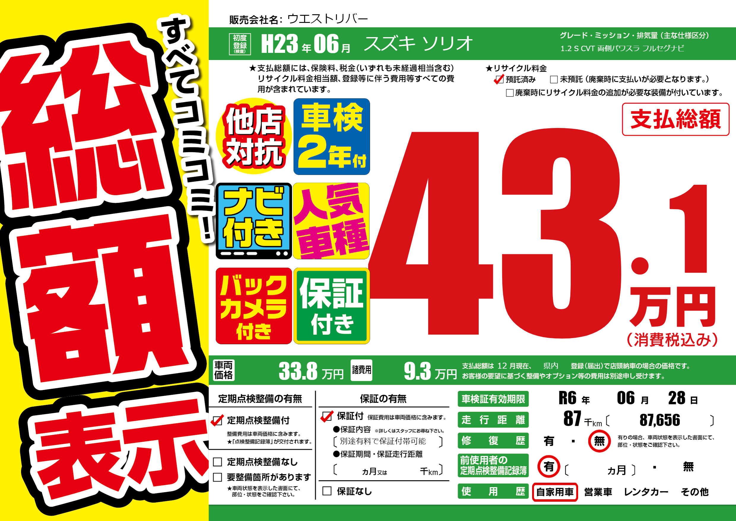 | 走行キロ | 8.7万km | 初年度登録 | H23年06月 |