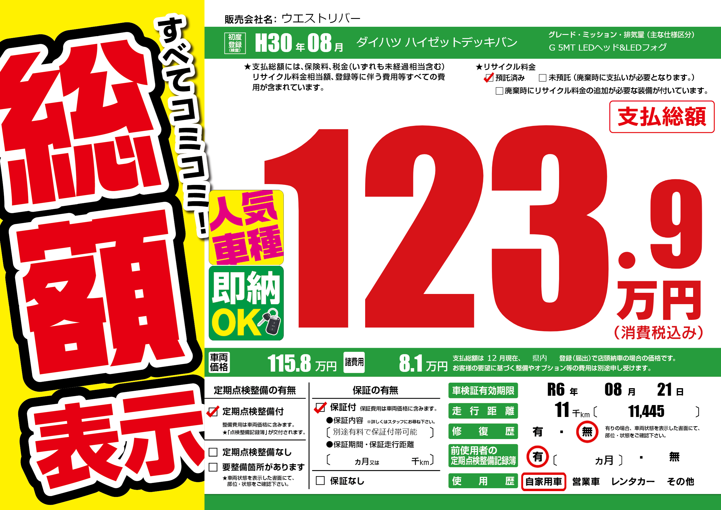 | 走行キロ | 1.1万km | 初年度登録 | H30年08月 |