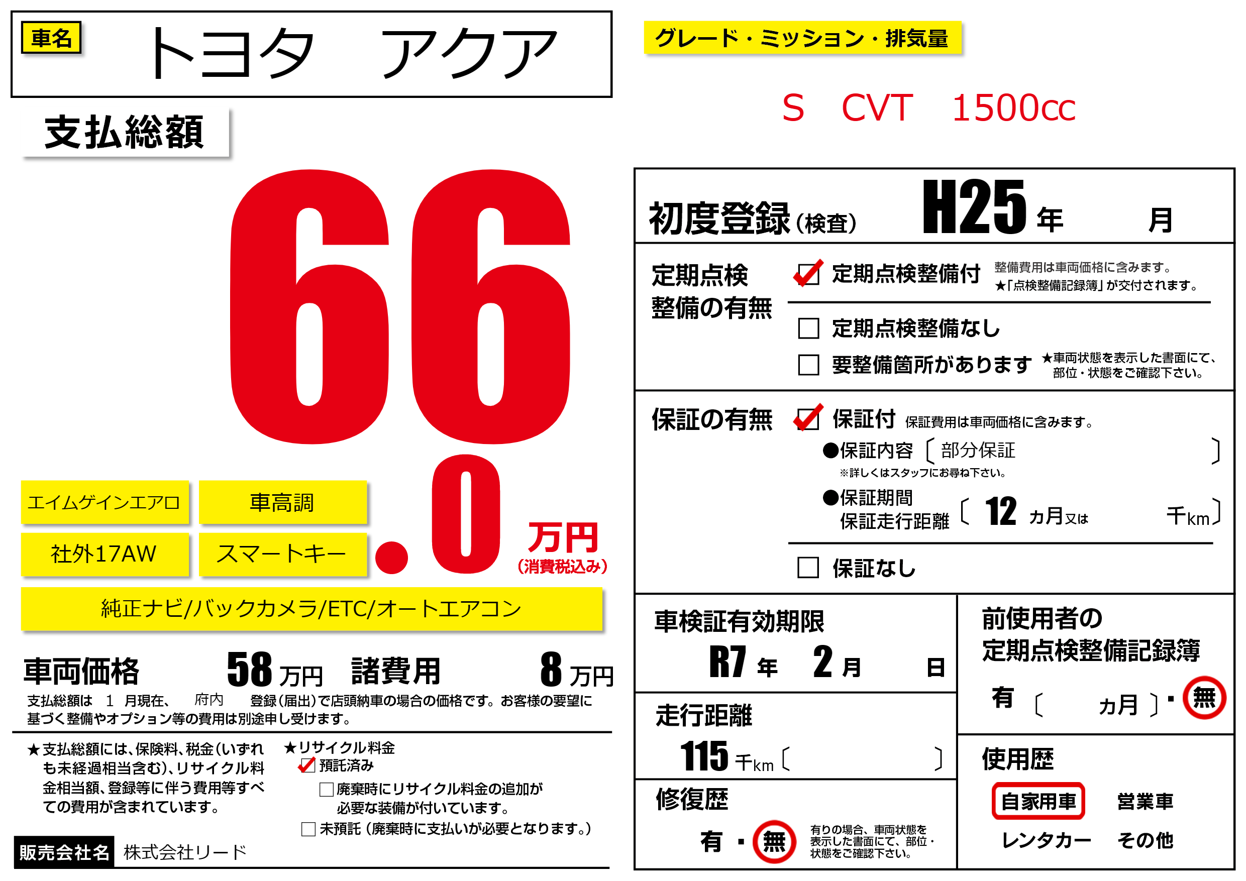 | 車名 | トヨタ アクア | グレード ミッション 排気量 |