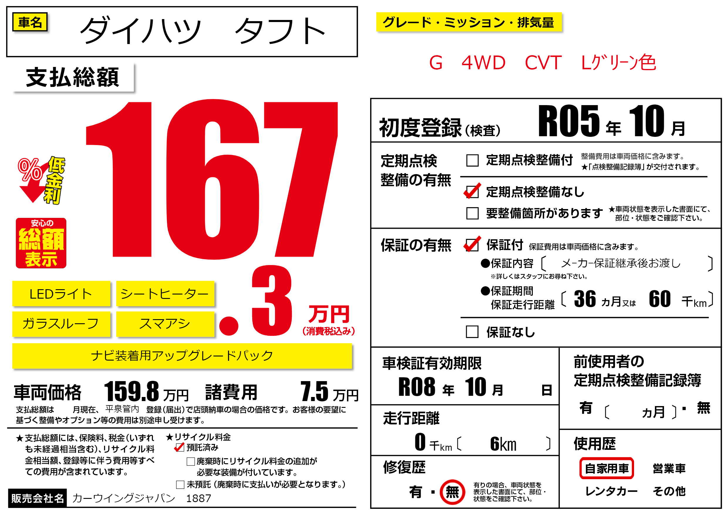 | 車名 | ダイハツ タフト | グレード ミッション 排気量 |