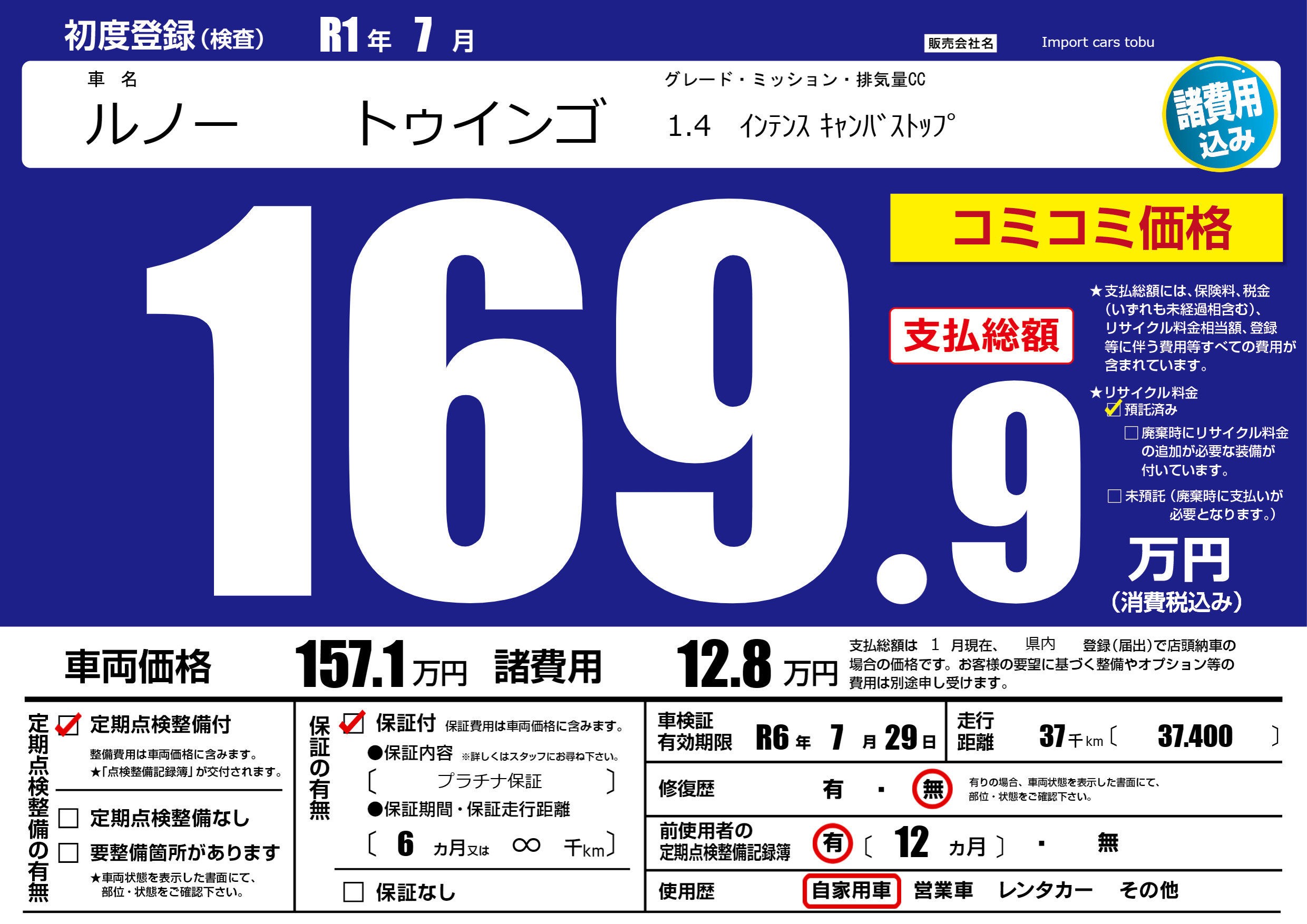 | 車名 | ルノー トゥインゴ | グレード ミッション 排気量 |