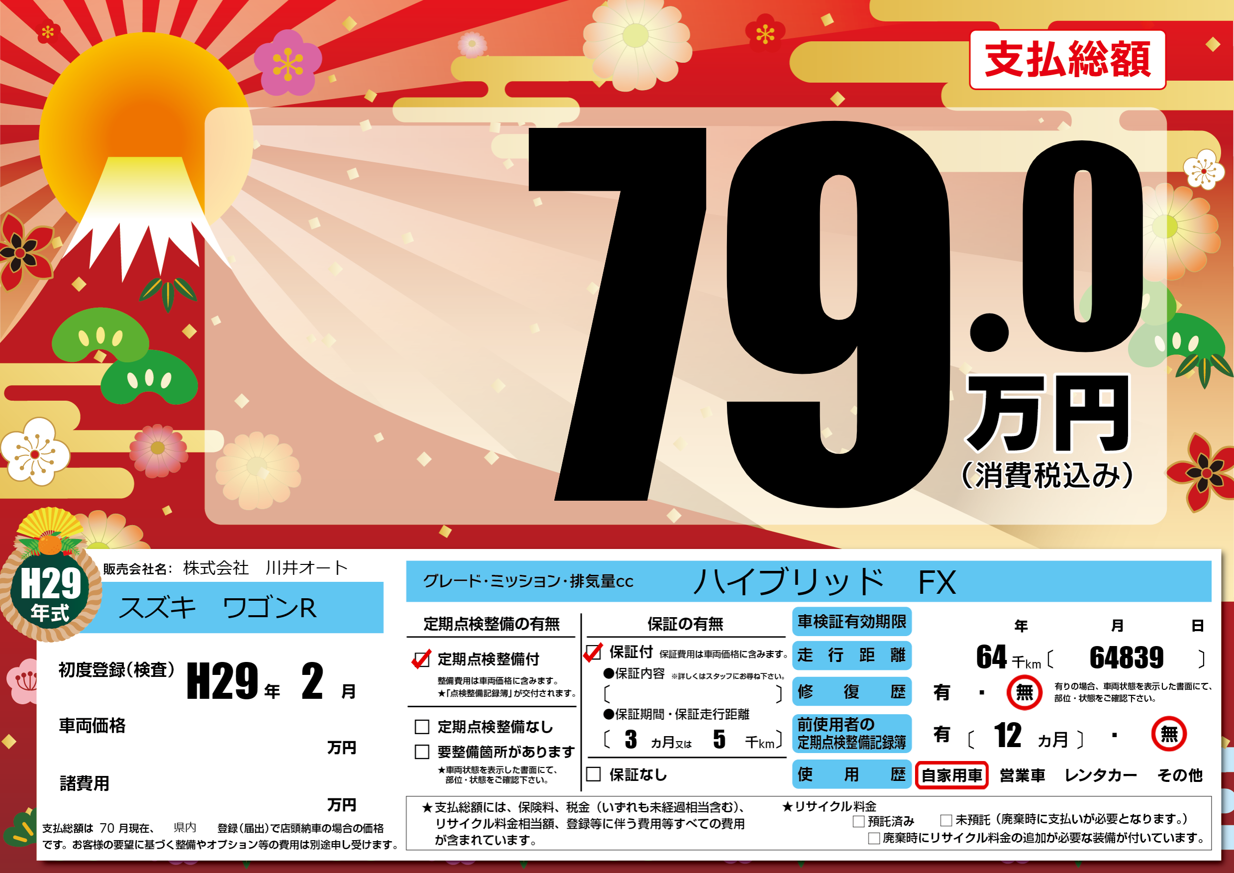 | 車名 | スズキ ワゴンR | グレード ミッション 排気量 |