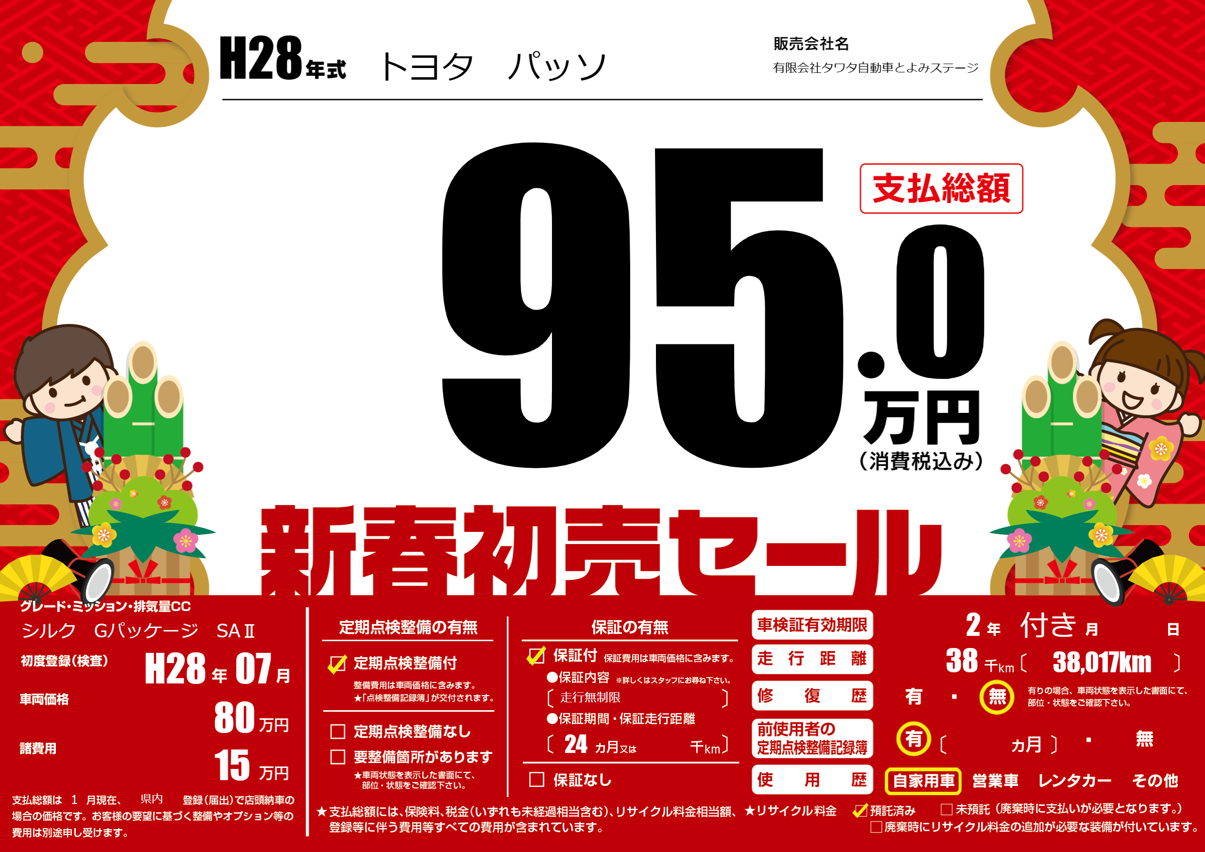 | 車名 | トヨタ パッソ | グレード ミッション 排気量 |