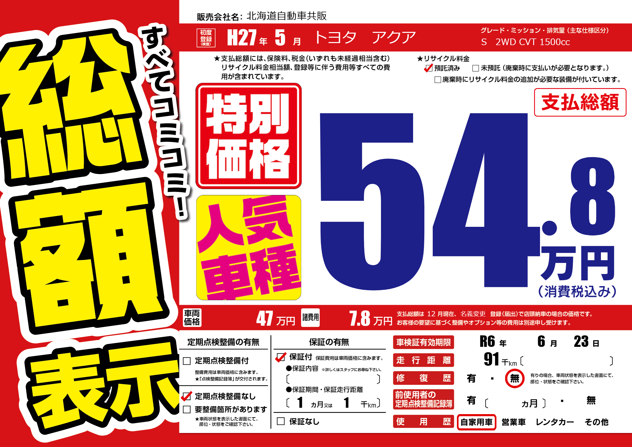 | 車名 | トヨタ アクア | グレード ミッション 排気量 |