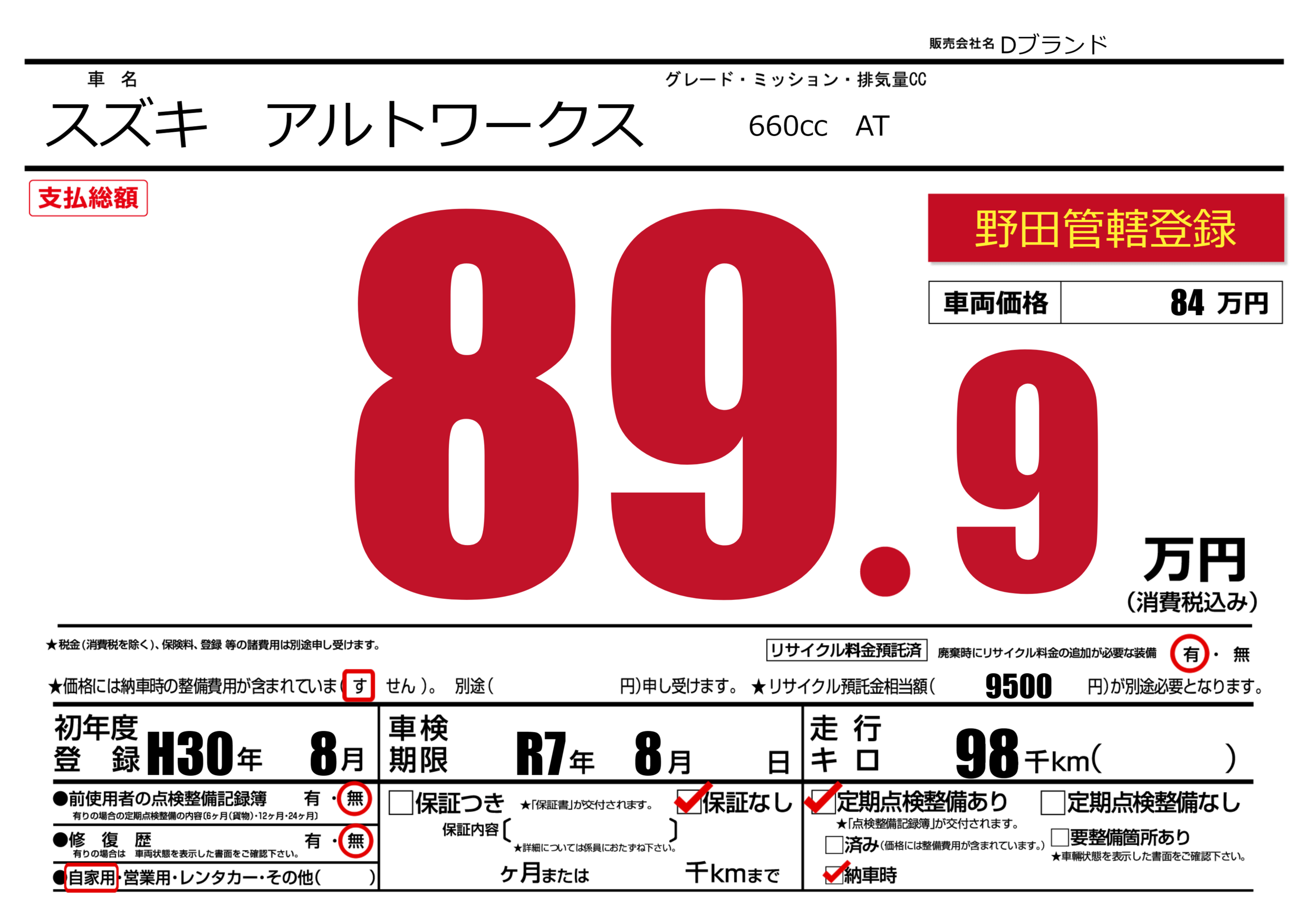 | 定期点検整備 | 定期点検整備あり 納車時あり | ||