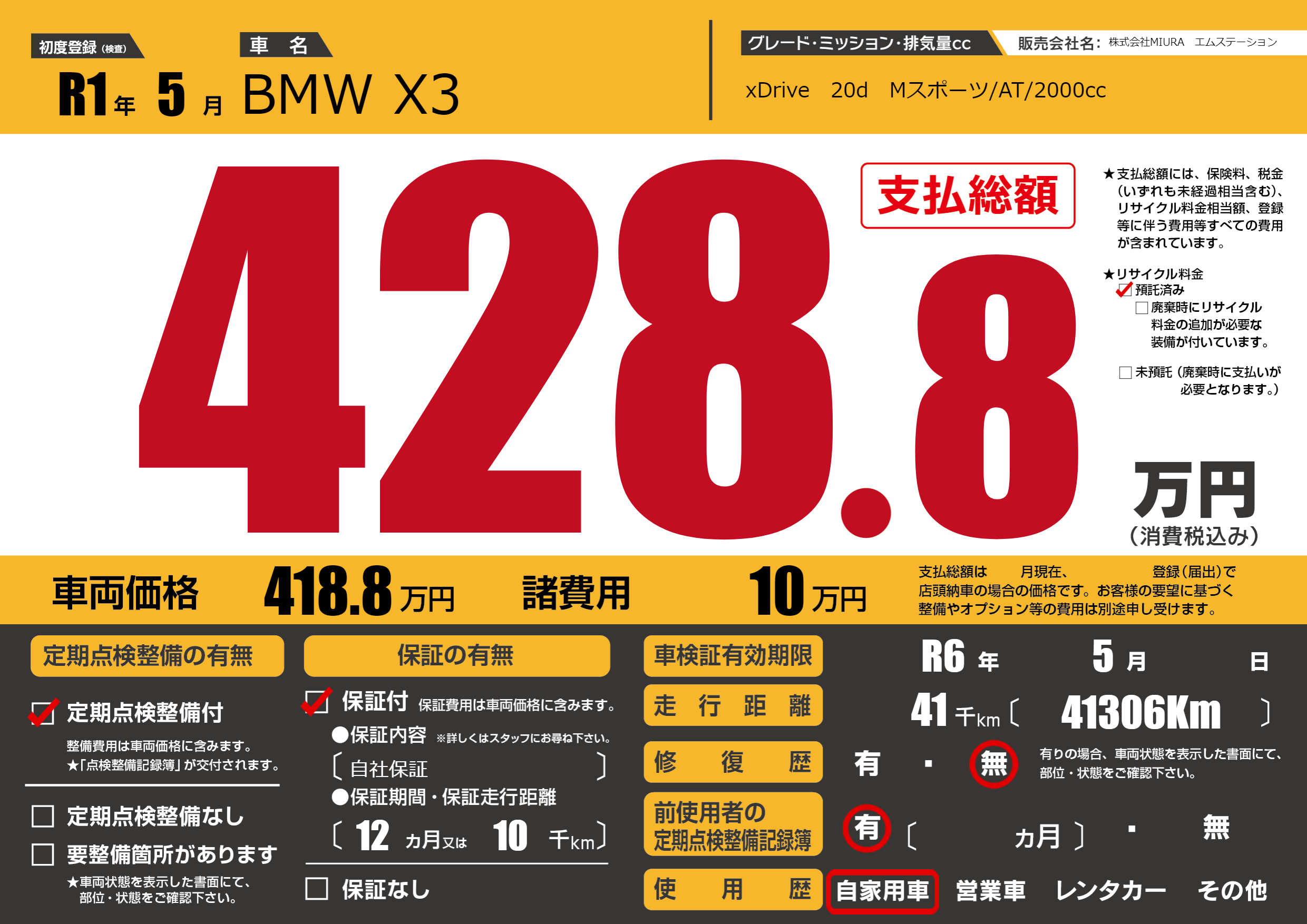 | 車名 | BMW X3 | グレード ミッション 排気量 |