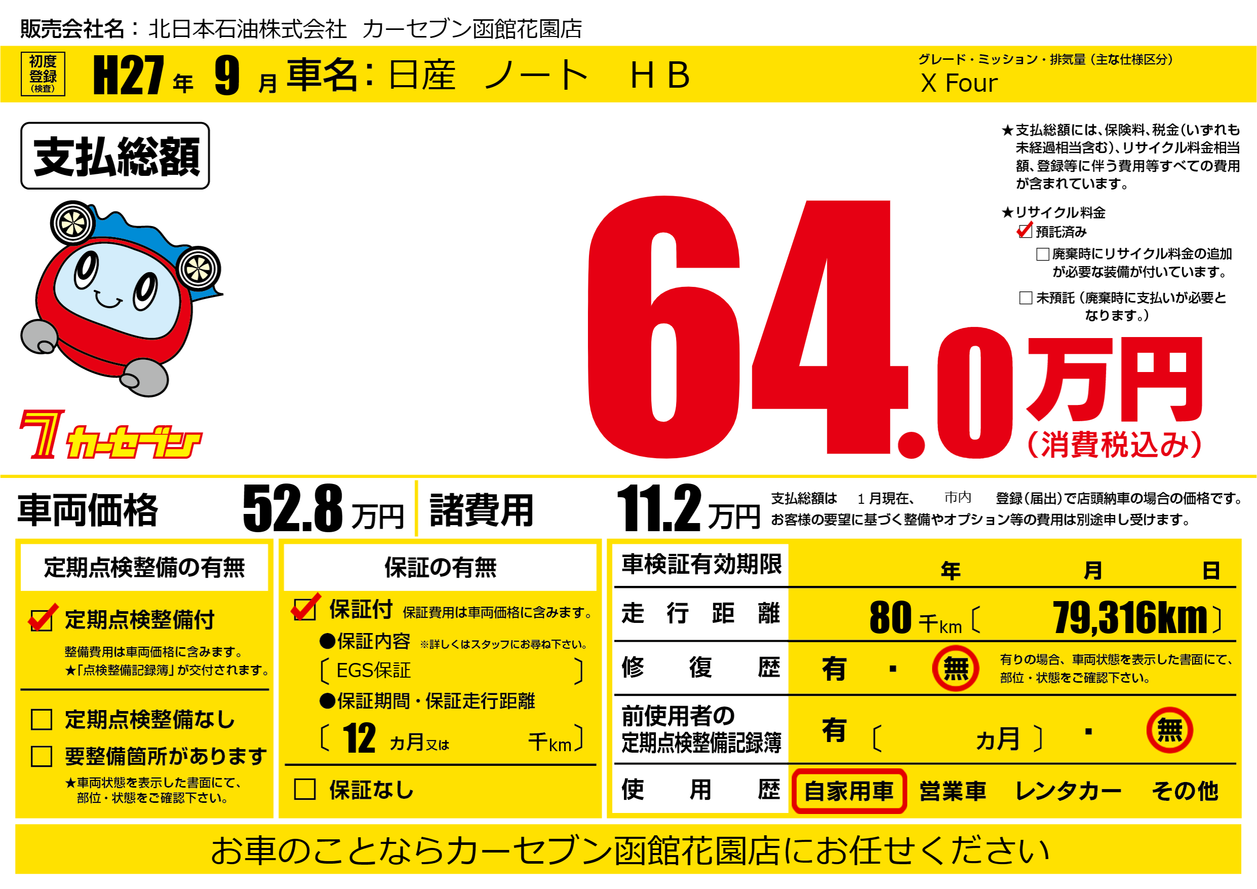 | 車名 | 日産 ノート HB | グレード ミッション 排気量 |
