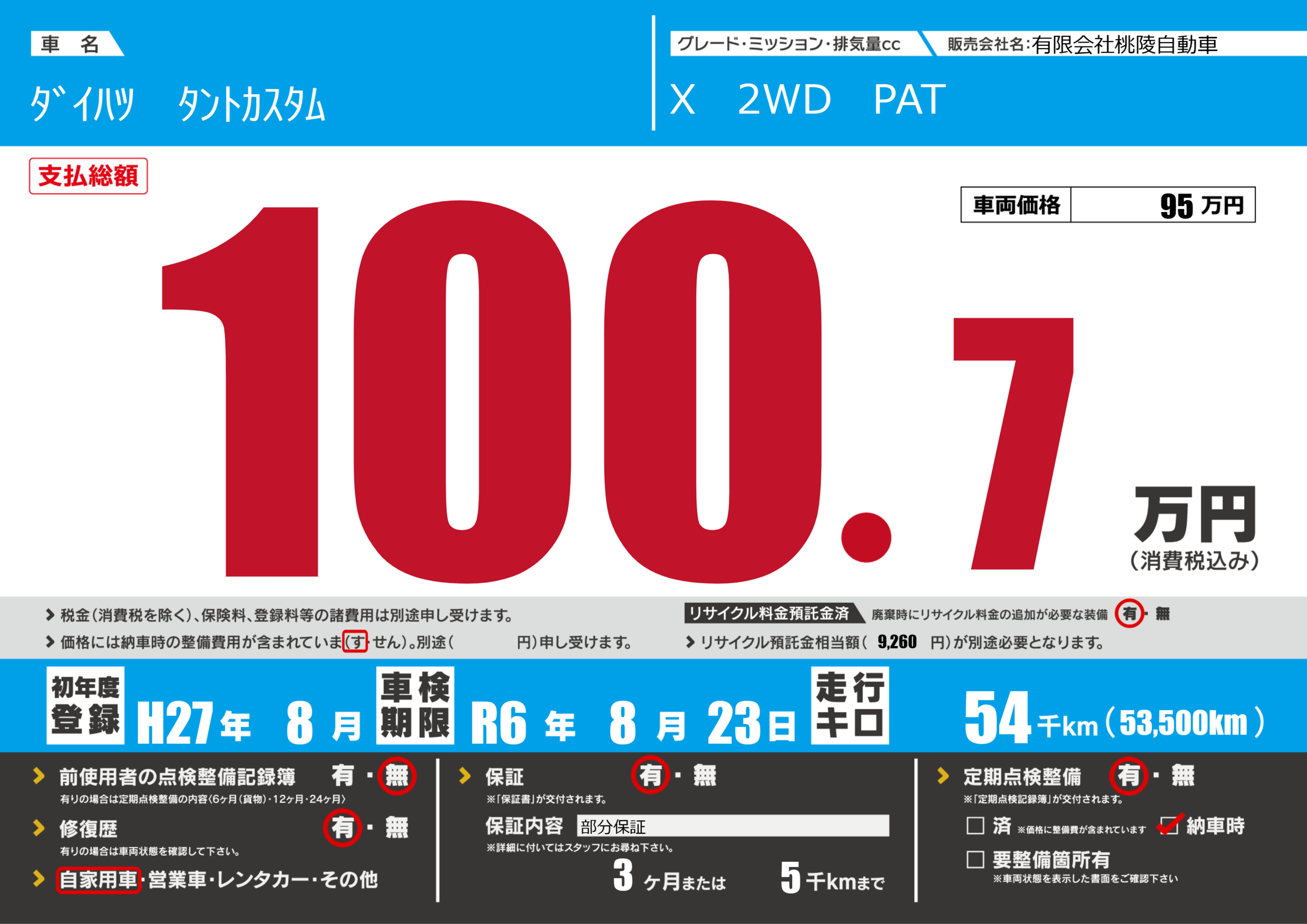 保証付き 保証内容(部分保証) 3ヶ月または(5)千kmまで |