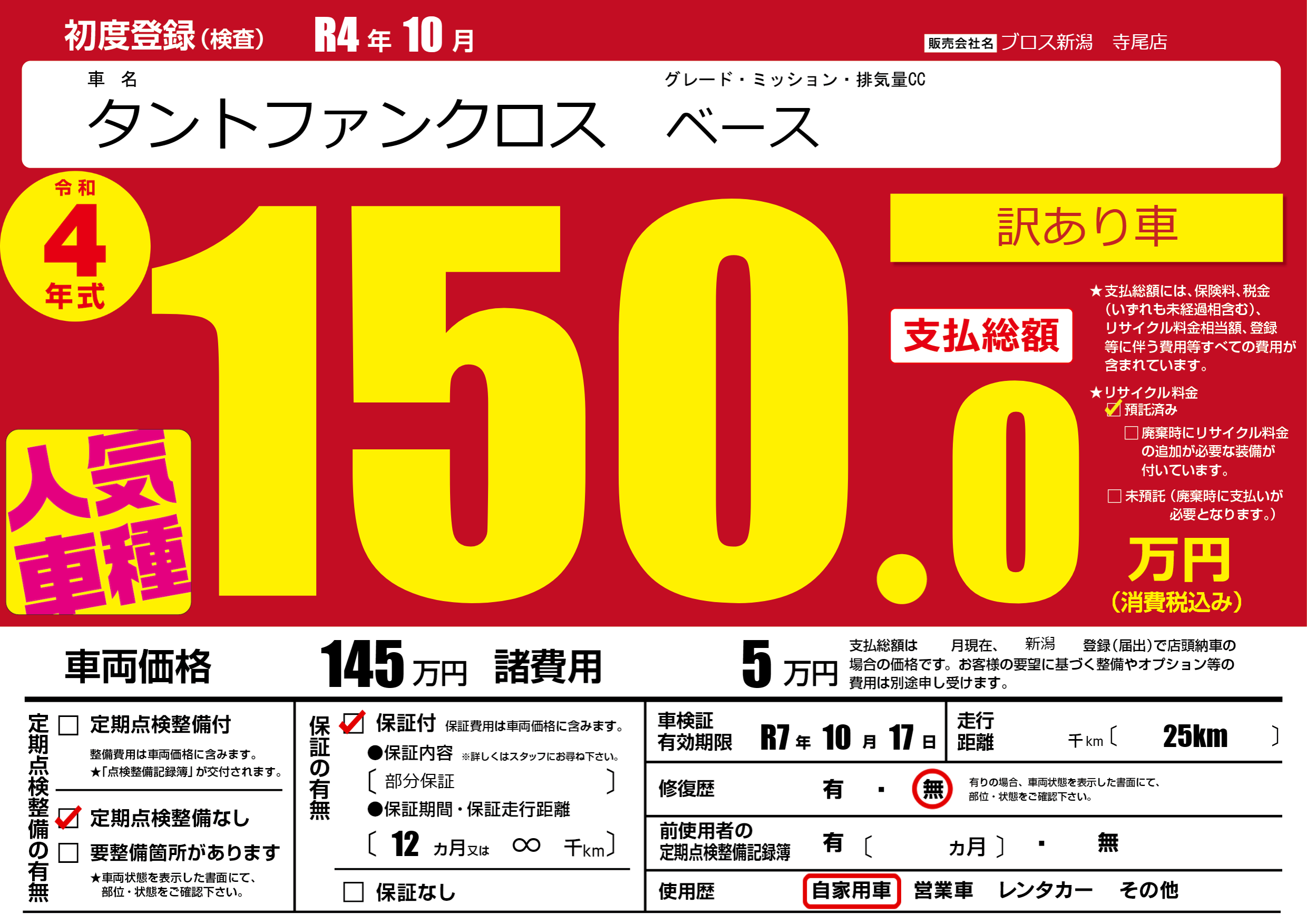 なし | 車検制限 | R7年10月17月 |
