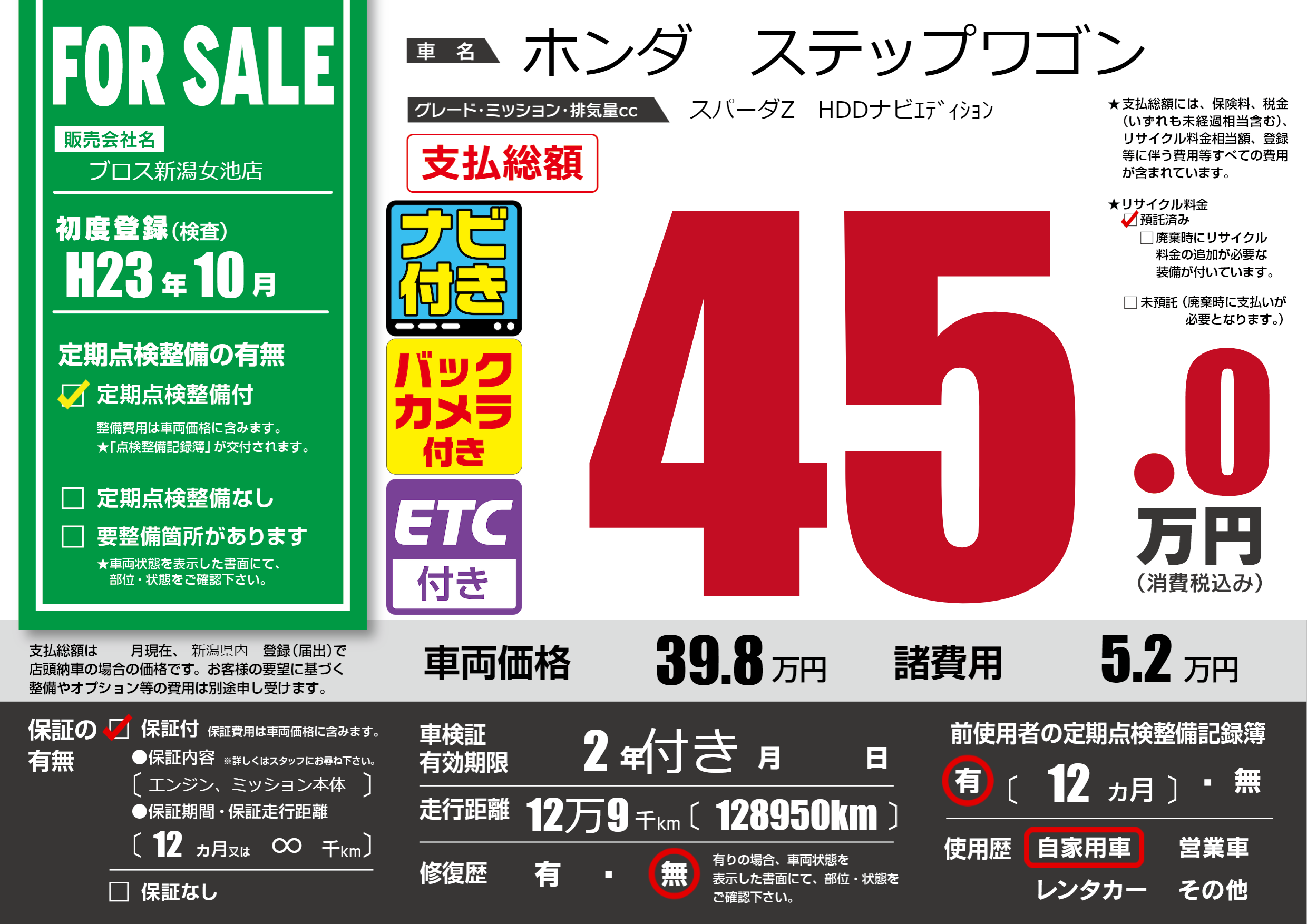| 走行キロ | 1.2万km | 初年度登録 | H23年10月 |