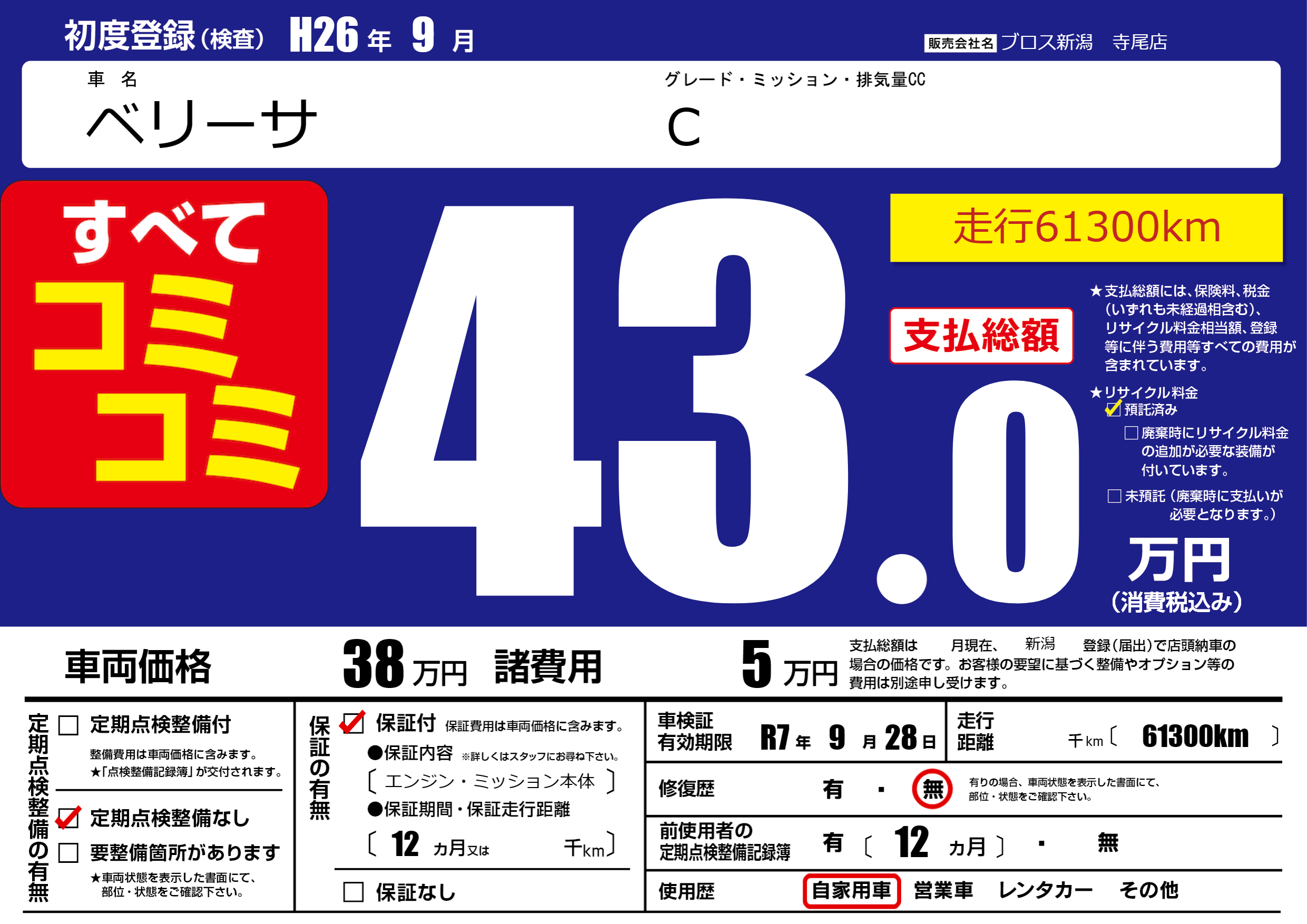 | 車名 | ベリーサ | グレード ミッション 排気量 |