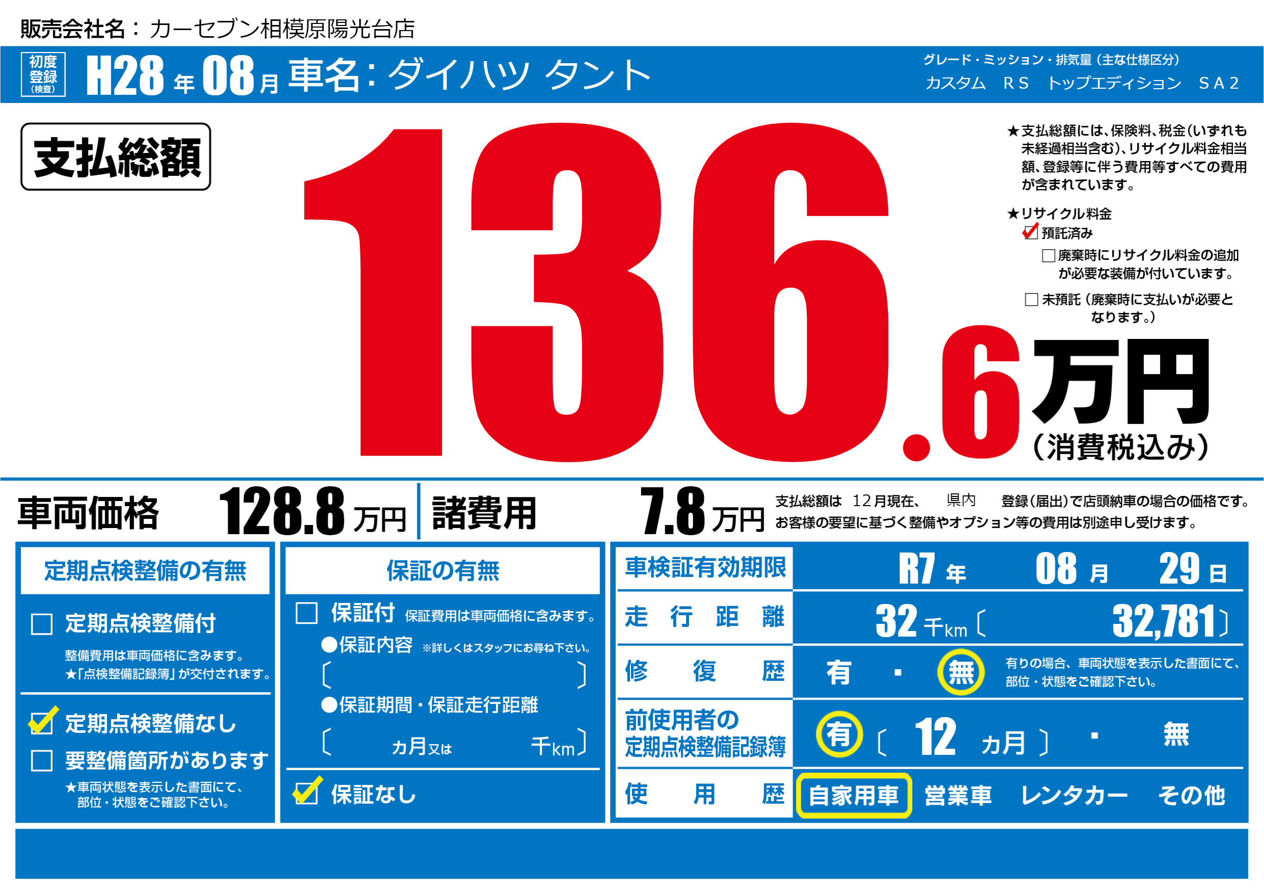 | 走行キロ | 3.2万km | 初年度登録 | H28年08月 |