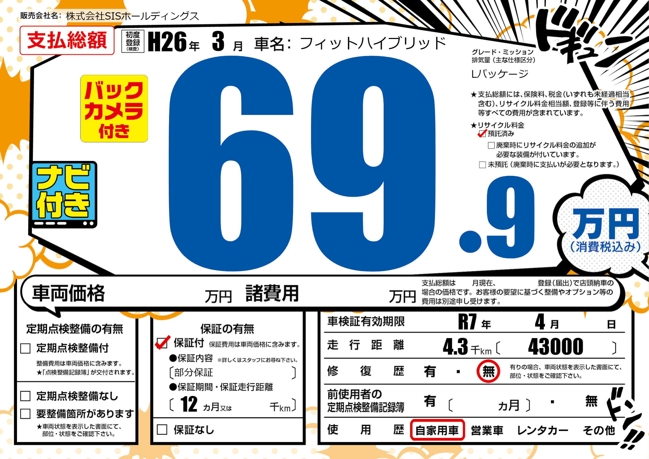 | 走行キロ | 0.4万km | 初年度登録 | H26年3月 |