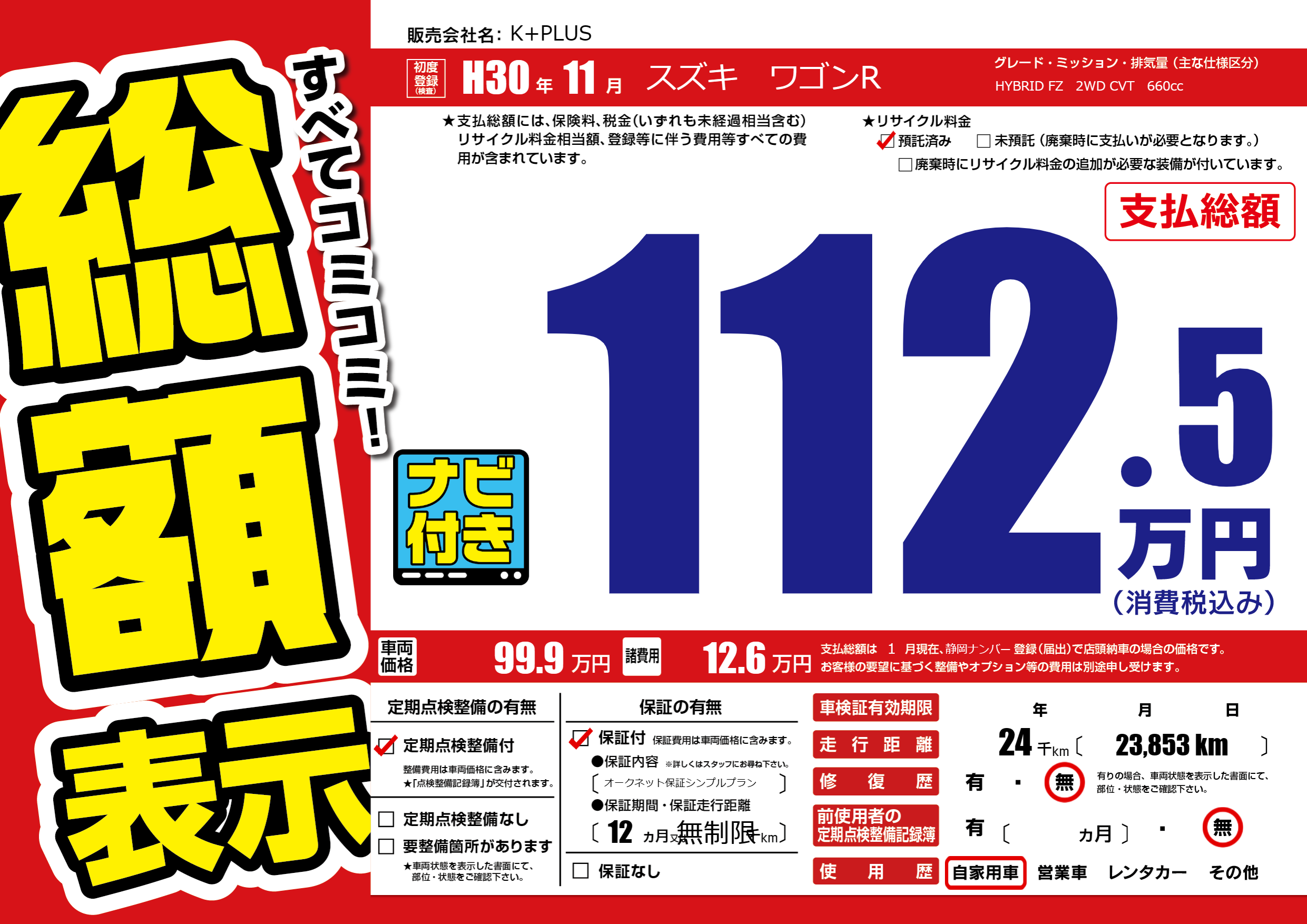 | 走行キロ | 2.4万km | 初年度登録 | H30年11月 |