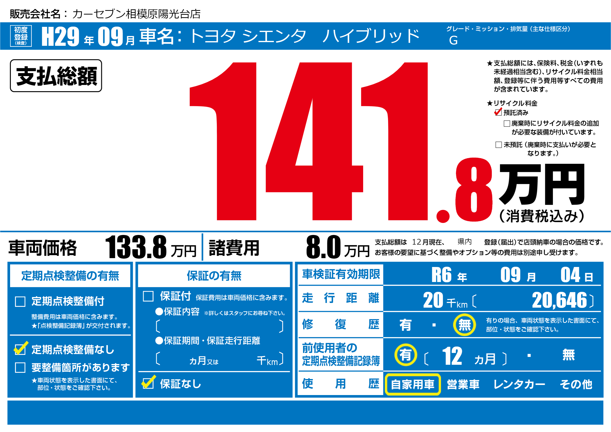 | 車検制限 | R6年 09月 04日 | ||
